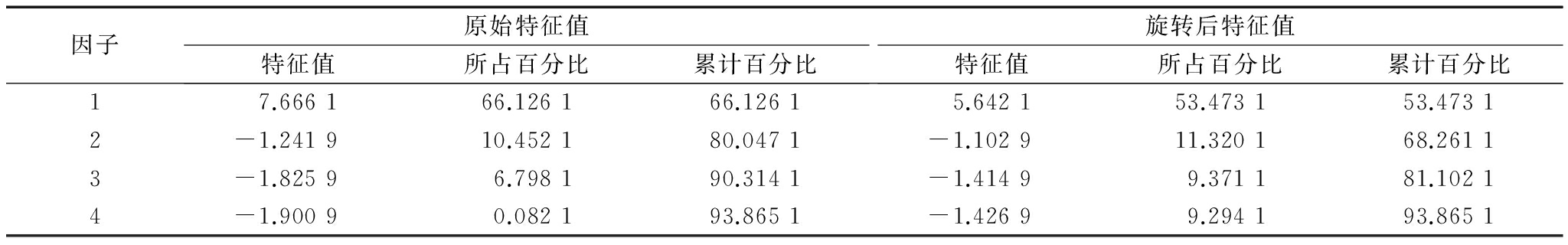 其次,运用软件SPSS21.0将标准化数据代入公式(2),计算出相关系数矩阵,再计算得到高技术企业间数字鸿沟测度指标数据特征值,如表2所示。其相应的主成分碎石图,如图1所示。从中可以看出,所生成的4个主要成分累计百分比为93.865 1,能够代表16项指标的大部分特征。