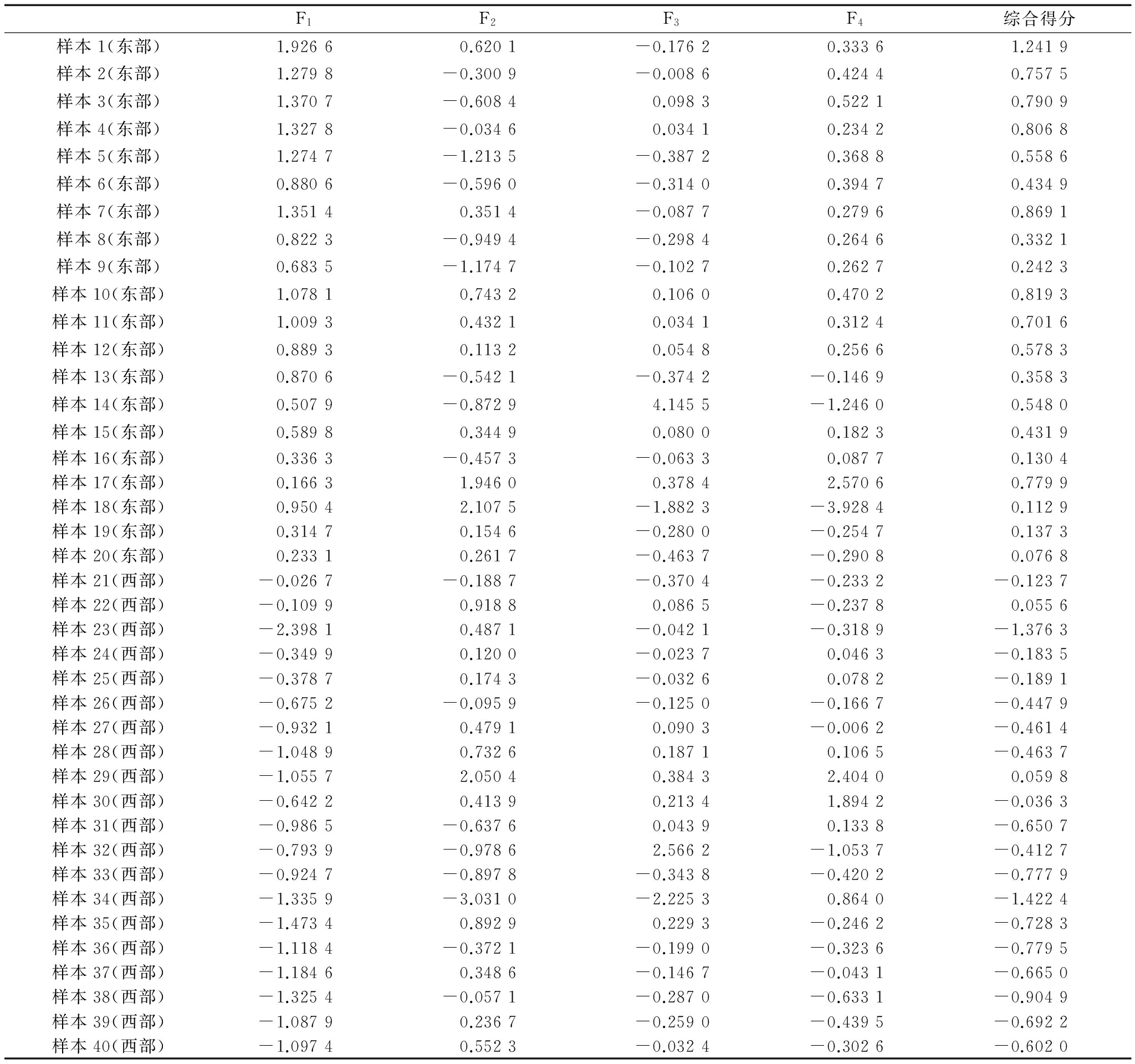 F1F2F3F4综合得分样本1(东部)1.92660.6201-0.17620.33361.2419样本2(东部)1.2798-0.3009-0.00860.42440.7575样本3(东部)1.3707-0.60840.09830.52210.7909样本4(东部)1.3278-0.03460.03410.23420.8068样本5(东部)1.2747-1.2135-0.38720.36880.5586样本6(东部)0.8806-0.5960-0.31400.39470.4349样本7(东部)1.35140.3514-0.08770.27960.8691样本8(东部)0.8223-0.9494-0.29840.26460.3321样本9(东部)0.6835-1.1747-0.10270.26270.2423样本10(东部)1.07810.74320.10600.47020.8193样本11(东部)1.00930.43210.03410.31240.7016样本12(东部)0.88930.11320.05480.25660.5783样本13(东部)0.8706-0.5421-0.3742-0.14690.3583样本14(东部)0.5079-0.87294.1455-1.24600.5480样本15(东部)0.58980.34490.08000.18230.4319样本16(东部)0.3363-0.4573-0.06330.08770.1304样本17(东部)0.16631.94600.37842.57060.7799样本18(东部)0.95042.1075-1.8823-3.92840.1129样本19(东部)0.31470.1546-0.2800-0.25470.1373样本20(东部)0.23310.2617-0.4637-0.29080.0768样本21(西部)-0.0267-0.1887-0.3704-0.2332-0.1237样本22(西部)-0.10990.91880.0865-0.23780.0556样本23(西部)-2.39810.4871-0.0421-0.3189-1.3763样本24(西部)-0.34990.1200-0.02370.0463-0.1835样本25(西部)-0.37870.1743-0.03260.0782-0.1891样本26(西部)-0.6752-0.0959-0.1250-0.1667-0.4479样本27(西部)-0.93210.47910.0903-0.0062-0.4614样本28(西部)-1.04890.73260.18710.1065-0.4637样本29(西部)-1.05572.05040.38432.40400.0598样本30(西部)-0.64220.41390.21341.8942-0.0363样本31(西部)-0.9865-0.63760.04390.1338-0.6507样本32(西部)-0.7939-0.97862.5662-1.0537-0.4127样本33(西部)-0.9247-0.8978-0.3438-0.4202-0.7779样本34(西部)-1.3359-3.0310-2.22530.8640-1.4224样本35(西部)-1.47340.89290.2293-0.2462-0.7283样本36(西部)-1.1184-0.3721-0.1990-0.3236-0.7795样本37(西部)-1.18460.3486-0.1467-0.0431-0.6650样本38(西部)-1.3254-0.0571-0.2870-0.6331-0.9049样本39(西部)-1.08790.2367-0.2590-0.4395-0.6922样本40(西部)-1.09740.5523-0.0324-0.3026-0.6020