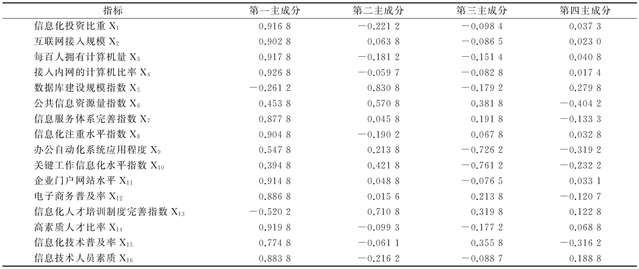 指标第一主成分第二主成分第三主成分第四主成分信息化投资比重X10.9168-0.2212-0.09840.0373互联网接入规模X20.90280.0638-0.08650.0230每百人拥有计算机量X30.9178-0.1812-0.15140.0408接入内网的计算机比率X40.9268-0.0597-0.08280.0174数据库建设规模指数X5-0.26120.8308-0.17920.2798公共信息资源量指数X60.45380.57080.3818-0.4042信息服务体系完善指数X70.87780.04580.1918-0.1333信息化注重水平指数X80.9048-0.19020.06780.0328办公自动化系统应用程度X90.54780.2138-0.7262-0.3192关键工作信息化水平指数X100.39480.4218-0.7612-0.2322企业门户网站水平X110.91480.0488-0.07650.0331电子商务普及率X120.88680.01560.2138-0.1207信息化人才培训制度完善指数X13-0.52020.71080.31980.1228高素质人才比率X140.9198-0.0993-0.17720.0688信息化技术普及率X150.7748-0.06110.3558-0.3162信息技术人员素质X160.8838-0.2162-0.08870.1888