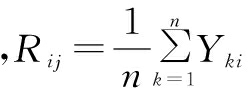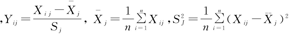 (1)原始数据标准化。设指标体系中共包含p个指标,依次为X1,X2,X3…,Xp(样本容量为p),Xij为第i个样本的第j个值。设由此得到的样本矩阵为X=(Xij)n*p,由于p个指标纲量往往不同,因此需要对p个指标进行标准化,其公式为:
