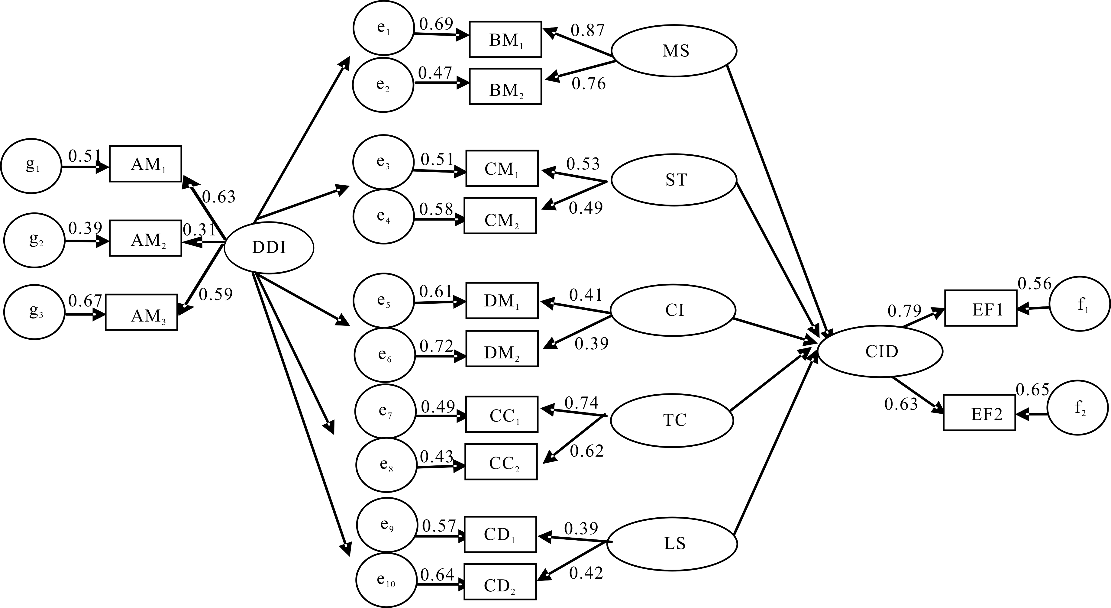本文结构方程模型包括7个变量:高技术企业间数字鸿沟、管理方式、战略目标、合作投入、团队分工、学习-吸收能力和协同创新,分别记作DDI、MS、ST、CI、TC、LC、CID。