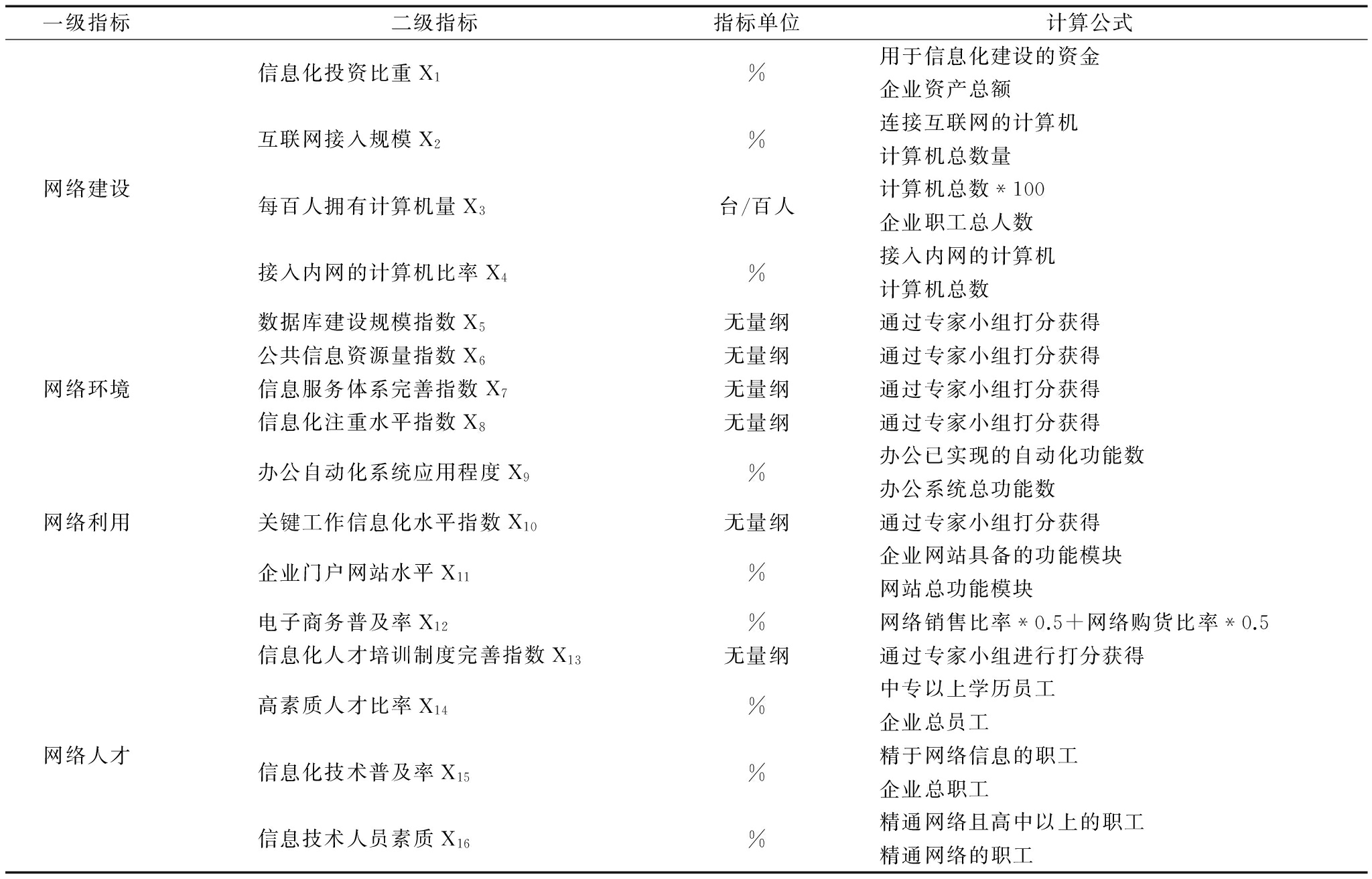 一级指标二级指标指标单位计算公式信息化投资比重X1%用于信息化建设的资金企业资产总额互联网接入规模X2%连接互联网的计算机计算机总数量网络建设每百人拥有计算机量X3台/百人计算机总数*100企业职工总人数接入内网的计算机比率X4%接入内网的计算机计算机总数数据库建设规模指数X5无量纲通过专家小组打分获得公共信息资源量指数X6无量纲通过专家小组打分获得网络环境信息服务体系完善指数X7无量纲通过专家小组打分获得信息化注重水平指数X8无量纲通过专家小组打分获得办公自动化系统应用程度X9%办公已实现的自动化功能数办公系统总功能数网络利用关键工作信息化水平指数X10无量纲通过专家小组打分获得企业门户网站水平X11%企业网站具备的功能模块网站总功能模块电子商务普及率X12%网络销售比率*0.5+网络购货比率*0.5信息化人才培训制度完善指数X13无量纲通过专家小组进行打分获得高素质人才比率X14%中专以上学历员工企业总员工网络人才信息化技术普及率X15%精于网络信息的职工企业总职工信息技术人员素质X16%精通网络且高中以上的职工精通网络的职工
