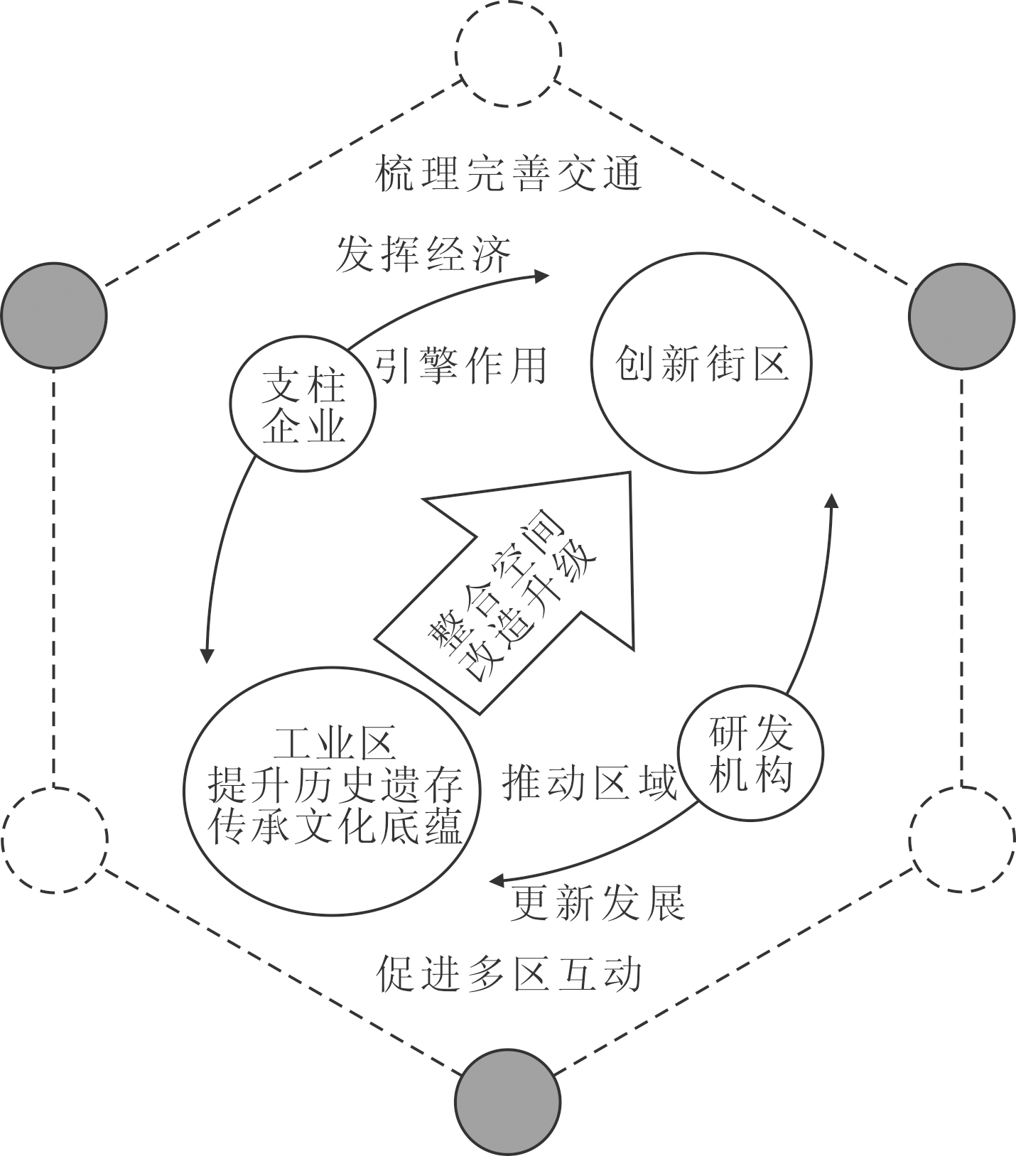 在空间布局上,水岸“工业锈带”改造型创新街区源于邻近水岸的老旧工业区。长期以来,该区域只注重发展工业尤其是重工业,在产业结构布局上形成“一荣俱荣、一损俱损”的局面,其功能定位不能适应城市规划和知识经济的发展,多数传统工业基地都经历了从“工业地带”的繁荣到“工业锈带”的衰退。因此,老旧工业区迫切需要凭借邻近水岸、交通发达的地理优势进行产业转型升级,构建全新的城市创新空间形态,以推动本区域经济繁荣发展。水岸“工业锈带”改造型创新街区构建:首先,对已有交通体系重新梳理,加强与城市其它区域的联系与互动;其次,提升传统工业区历史建筑的文化底蕴,以低成本优势有效整合空间资源,从而推进城市更新与科技创新不断融合,如图2所示。在工业区改造升级过程中,应注重多元开放,吸引更多具有雄厚实力的先进研发机构、支柱性企业等经济资产进驻该区域,实现工业区、研发机构、支柱型企业以及城市其它区域多区融合,共同推动创新街区发展,最终将整个“工业锈带”转化成为生产、消费、流通、研发的闭环空间,走出一条从工业区到知识区再到创新区的创新驱动转型发展之路。