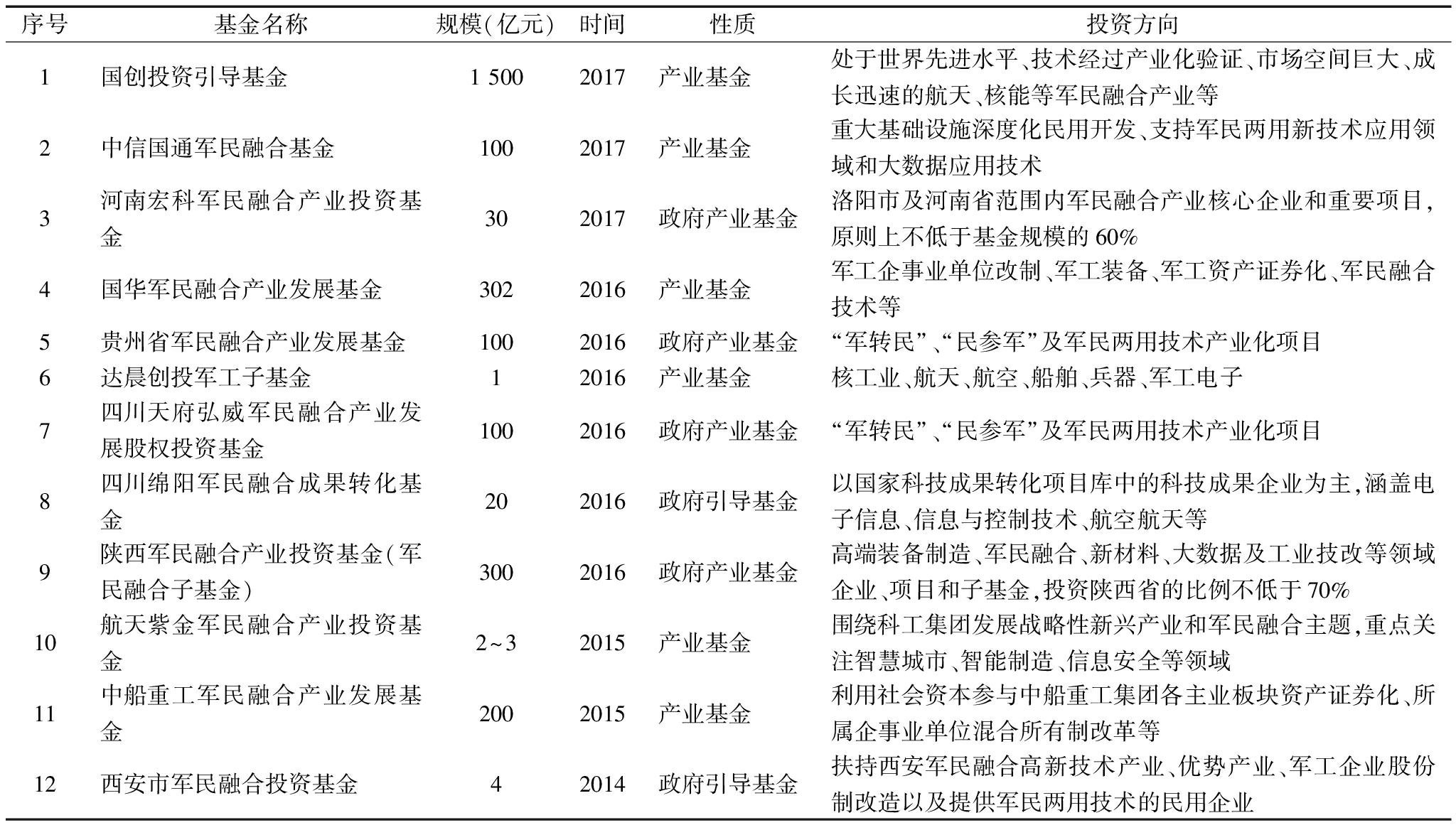 序号基金名称规模(亿元)时间性质投资方向1国创投资引导基金15002017产业基金处于世界先进水平、技术经过产业化验证、市场空间巨大、成长迅速的航天、核能等军民融合产业等2中信国通军民融合基金1002017产业基金重大基础设施深度化民用开发、支持军民两用新技术应用领域和大数据应用技术3河南宏科军民融合产业投资基金302017政府产业基金洛阳市及河南省范围内军民融合产业核心企业和重要项目,原则上不低于基金规模的60%4国华军民融合产业发展基金3022016产业基金军工企事业单位改制、军工装备、军工资产证券化、军民融合技术等5贵州省军民融合产业发展基金1002016政府产业基金“军转民”、“民参军”及军民两用技术产业化项目6达晨创投军工子基金12016产业基金核工业、航天、航空、船舶、兵器、军工电子7四川天府弘威军民融合产业发展股权投资基金1002016政府产业基金“军转民”、“民参军”及军民两用技术产业化项目8四川绵阳军民融合成果转化基金202016政府引导基金以国家科技成果转化项目库中的科技成果企业为主,涵盖电子信息、信息与控制技术、航空航天等9陕西军民融合产业投资基金(军民融合子基金)3002016政府产业基金高端装备制造、军民融合、新材料、大数据及工业技改等领域企业、项目和子基金,投资陕西省的比例不低于70%10航天紫金军民融合产业投资基金2~32015产业基金围绕科工集团发展战略性新兴产业和军民融合主题,重点关注智慧城市、智能制造、信息安全等领域11中船重工军民融合产业发展基金2002015产业基金利用社会资本参与中船重工集团各主业板块资产证券化、所属企事业单位混合所有制改革等12西安市军民融合投资基金42014政府引导基金扶持西安军民融合高新技术产业、优势产业、军工企业股份制改造以及提供军民两用技术的民用企业