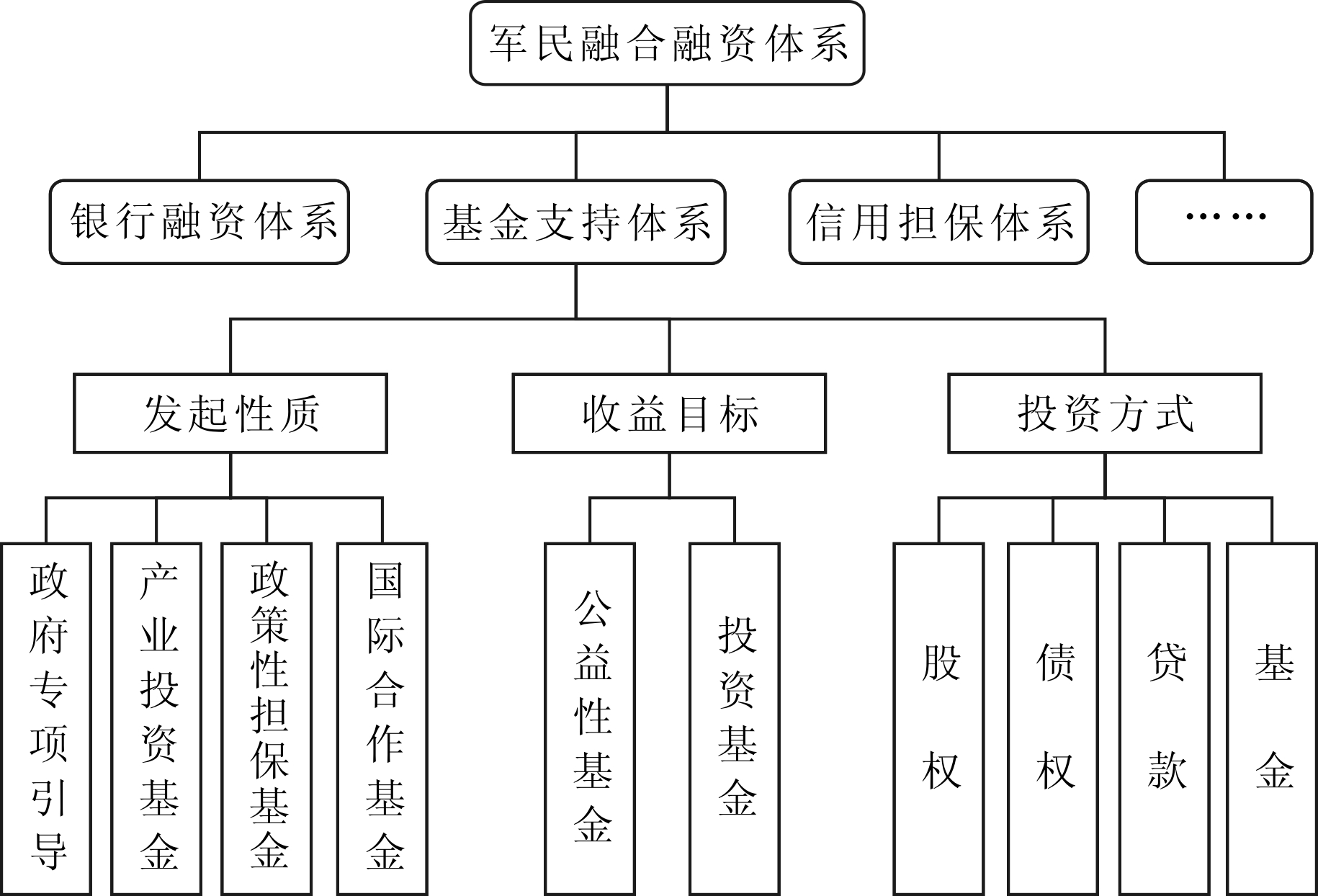 基金支持体系与银行融资体系、信用担保体系等构成军民融合融资框架体系(见图1),基金形式活跃于银行融资模式,是引导社会资金投向实体经济的主要手段和平台载体。军民融合发展基金支持体系内部分类主要以招募说明书中基金确定的资产配置比例、业绩比较基准及投资目标为基础。具体而言,按发起性质可分为政府专项引导基金、产业投资基金、政策性担保基金、国际合作基金等多种类型,按收益目标形式可分为公益性基金和投资基金,按投资方式可分为股权、债权、贷款、基金等多元化投资基金。其中,以国家引导基金为发起人,联合地方政府、社保、保险等其它投资机构共同设立的各行业基金为主流,对推进军民融合深度发展具有重大意义。作为经济建设和国防建设协调发展政策工具,军民融合发展基金不仅要重视对接项目,加速军民融合发展,更要对中小企业发展给予足够的金融支撑、科技金融支撑、基础设施建设金融支撑,促进金融市场健康发展。