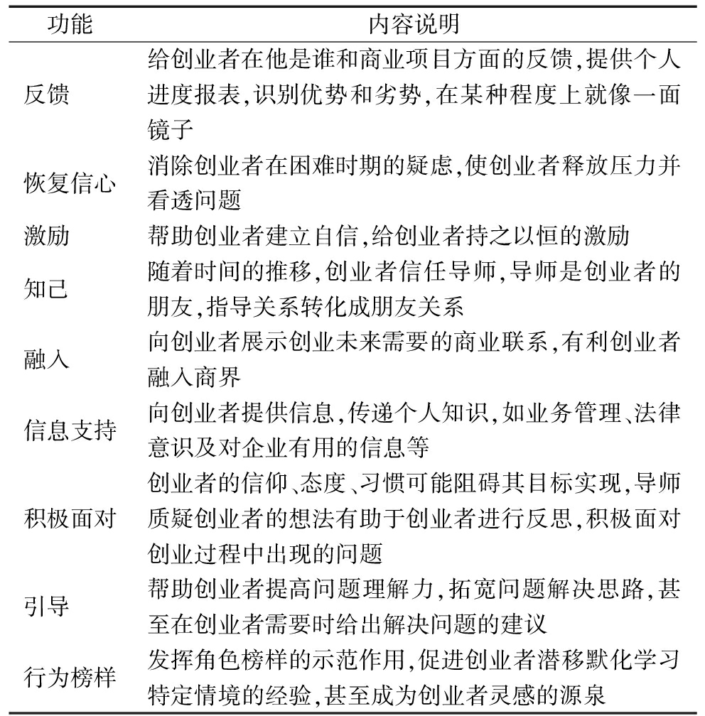 (3)导师功能不同。虽然企业导师和创业导师都为被指导者提供心理支持、职业支持和角色榜样[5,11],但是3种功能的本质内容不同。如表1所示,对于创业导师制来说,心理支持功能包括反馈、恢复信心、激励和知己;职业支持功能包括融入、信息支持、积极面对及引导[5]。并且,创业导师为创业者提供的是一种直接或间接支持[1,2]。具体来说,创业导师在指导过程中以教授为目的,向与自己有相似问题的初始创业者传授专业经验,帮助创业者开发技能,培养创业者的经营管理特质[6-8]。