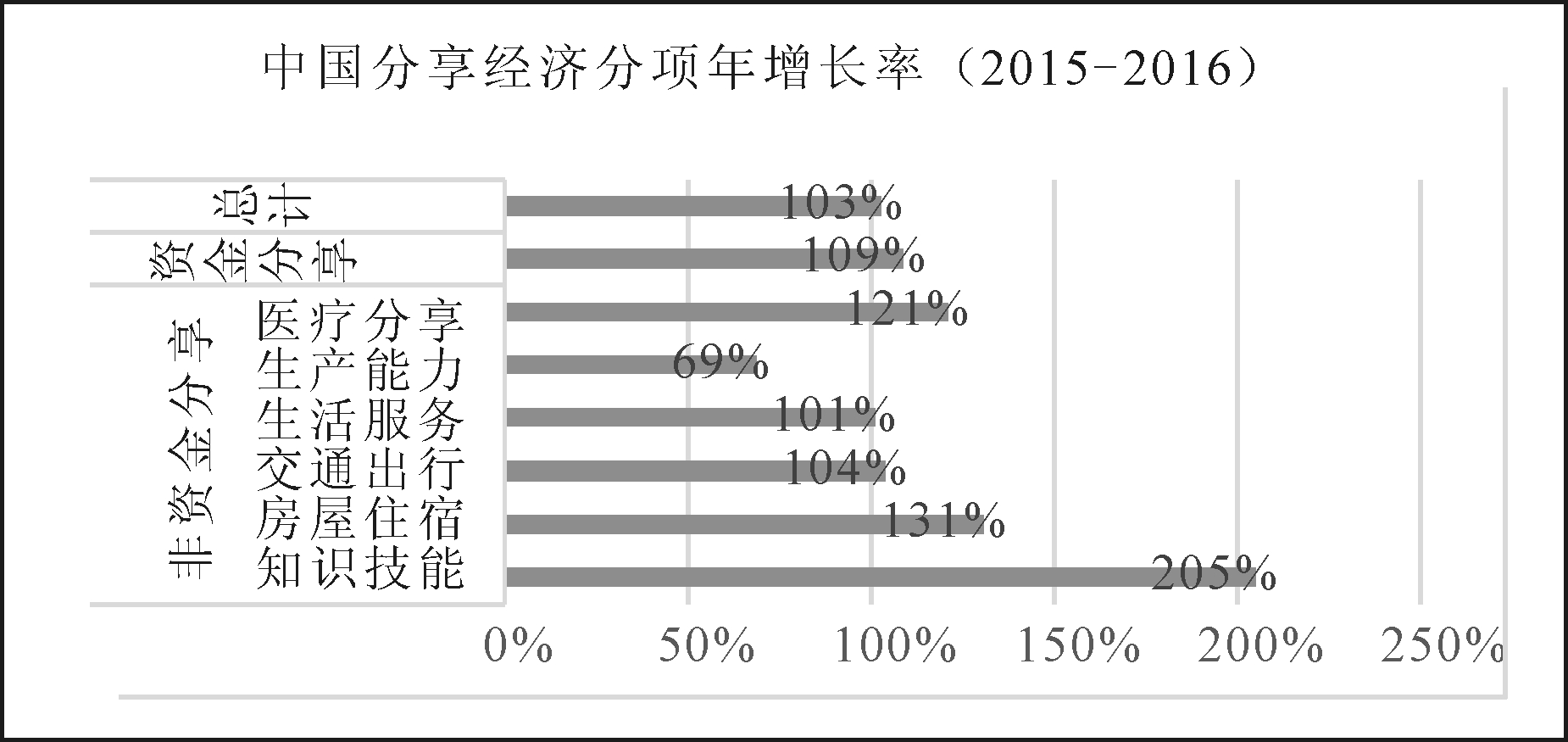 2015年我国分享经济的市场份额为1.7万亿元,2016年为3.4万亿元,增长率为103%。非资金类分享规模为1.3万亿元,比上年增长96%,其中,生活服务7 233亿元,增长率101%;生产能力3 380亿元,增长率69%;交通出行2 038亿元,增长率104%;知识技能610亿元,增长率205%;房屋住宿243亿元,增长率131%;医疗分享155亿元,增长率121%;资金分享20 863亿元,增长率109%(数据来自国家信息中心发布的中国分享经济发展报告2017)。