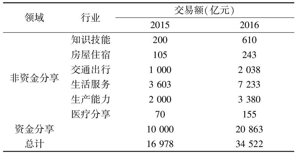 领域行业交易额(亿元)20152016非资金分享知识技能200610房屋住宿105243交通出行10002038生活服务36037233生产能力20003380医疗分享70155资金分享1000020863总计1697834522