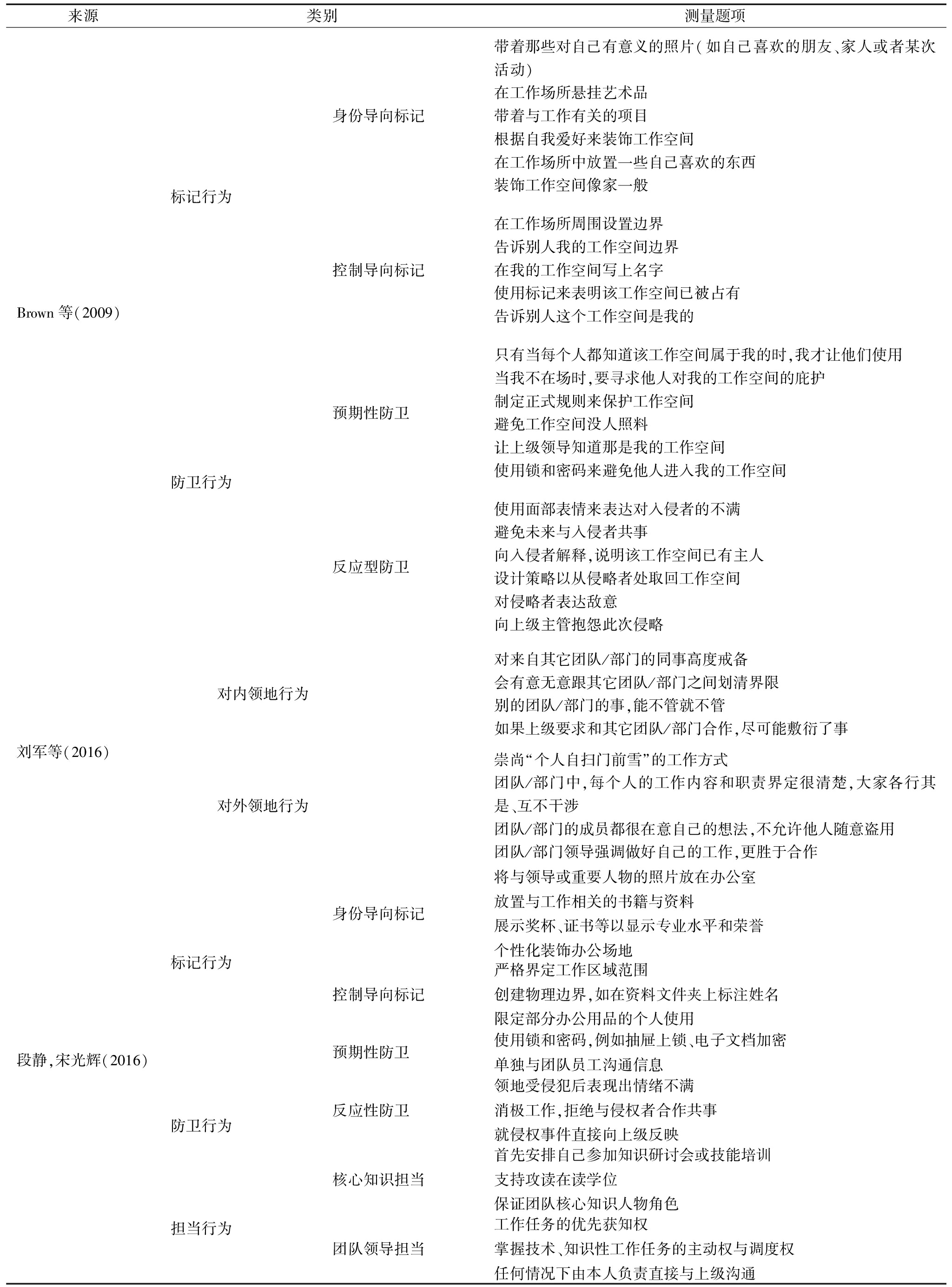 实证讨论领地性的前因后果,需要开发领地行为测量工具。Brown等[4]于2009年开发了领地行为量表,共包含4个维度、23个题项(见表1),但该量表主要针对物理形态的工作空间。实际上,企业组织中的非物理领地也很重要,需要得到更多关注。