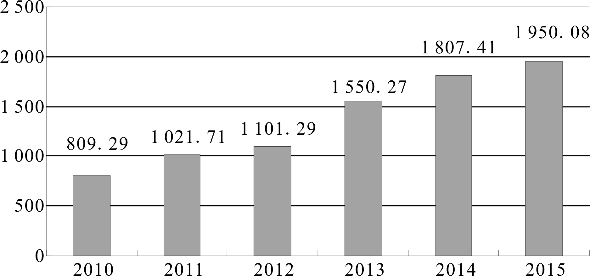 武汉坚持应用导向,初步构建了智慧城市应用体系。智慧政务方面,集成了99个市直政府部门、1 691余项公开数据和服务的“云端武汉公开数据库”已上线运行。该数据库覆盖部门最全、提供数据最多;智慧交通方面,建成“智能公交”系统,与阿里巴巴共建智能交通诱导服务系统,同时正在开发“停哪儿”智慧停车平台;智慧环保方面,推出武汉市环境空气质量APP;智慧社区方面,开展居家养老智能社区示范试点。武汉还在智慧教育、智慧医疗、智慧城管、智慧旅游、数字博物馆等方面实施了一批特色示范项目。武汉通过智慧城市建设,带动光电子信息、软件与信息服务、地球空间信息、云计算等产业做大做强。“光谷云村”、左岭大数据产业园等大数据产业基地建设初具规模,聚集了烽火众智、达梦数据库、立得空间、武汉迈异、火凤凰等一大批基础、潜力都很好的大数据、云计算企业。自2010年启动建设智慧武汉以来,武汉电子信息产业产值增长迅速,2015年达到1 950.08亿元(如图2所示)。