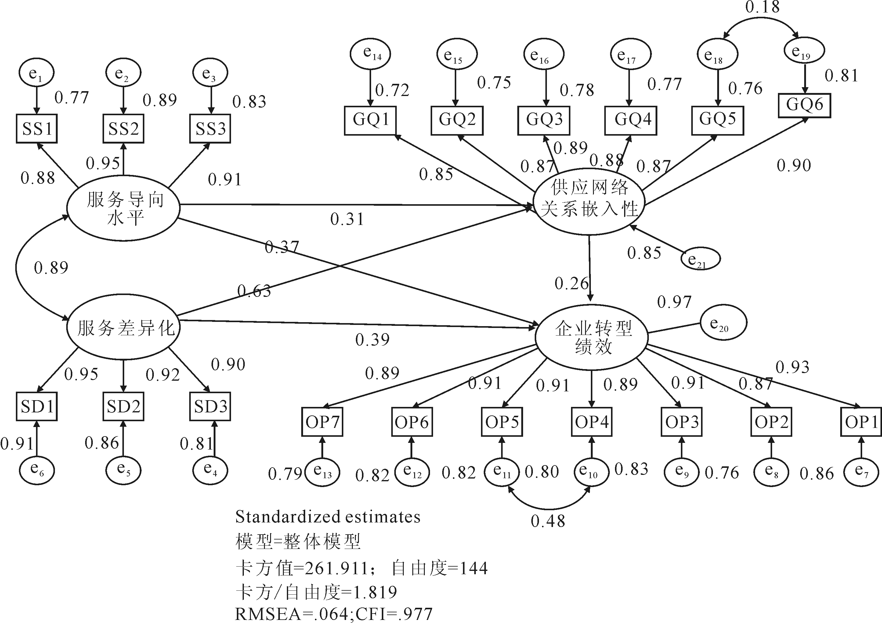 从间接模型的分析结果来看,服务导向水平、服务差异化对供应网络关系嵌入性及企业转型绩效都具有显著正向影响。模型各拟合指标都处于合理区间范围内,其中,卡方值(