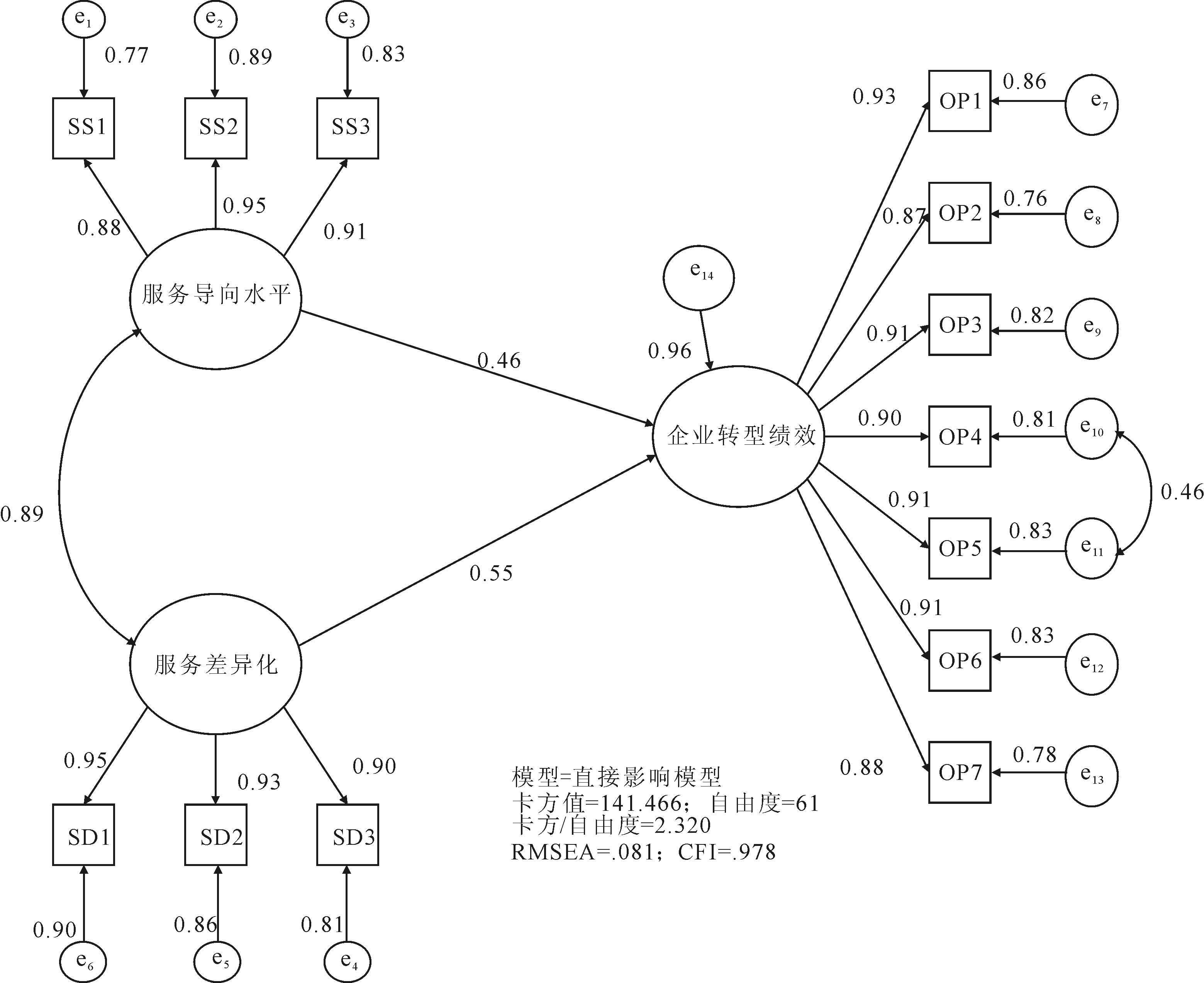 从直接效应模型的分析结果来看,服务导向水平、服务差异化对企业绩效都具有显著正向影响。模型各项拟合指标都处于合理区间范围内,其中,卡方值(