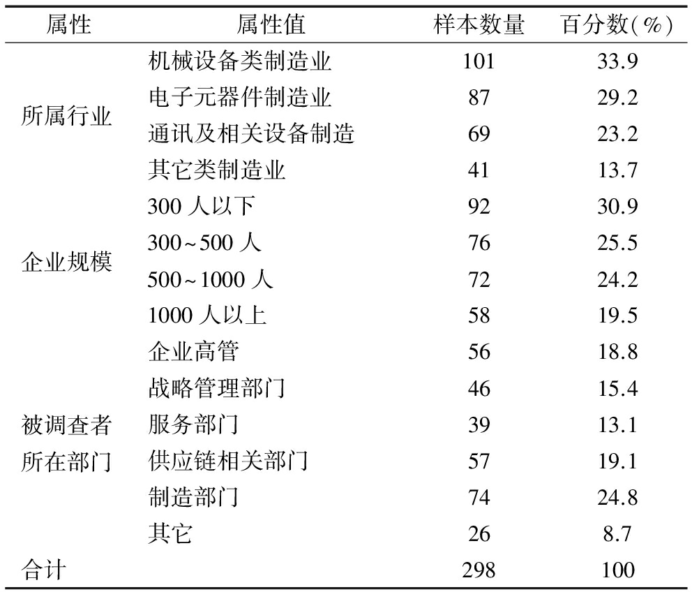 属性属性值样本数量百分数(%)所属行业机械设备类制造业10133.9电子元器件制造业8729.2通讯及相关设备制造6923.2其它类制造业4113.7企业规模300人以下9230.9300~500人7625.5500~1000人7224.21000人以上5819.5被调查者所在部门企业高管5618.8战略管理部门4615.4服务部门3913.1供应链相关部门5719.1制造部门7424.8其它268.7合计298100