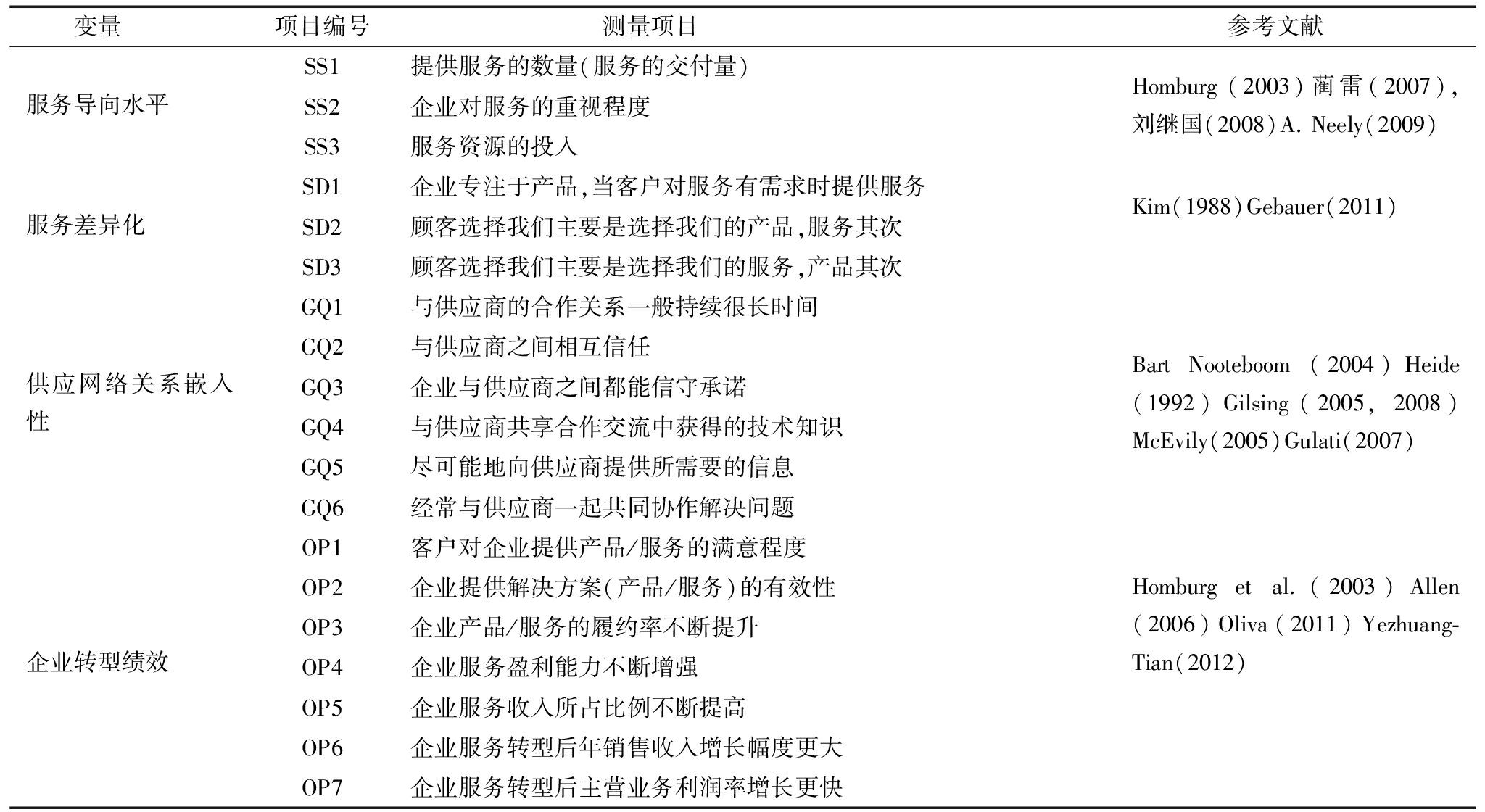 变量项目编号 测量项目 参考文献服务导向水平SS1提供服务的数量(服务的交付量)Homburg(2003)蔺雷(2007),刘继国(2008)A.Neely(2009)SS2企业对服务的重视程度SS3服务资源的投入服务差异化SD1企业专注于产品,当客户对服务有需求时提供服务Kim(1988)Gebauer(2011)SD2顾客选择我们主要是选择我们的产品,服务其次SD3顾客选择我们主要是选择我们的服务,产品其次供应网络关系嵌入性GQ1与供应商的合作关系一般持续很长时间BartNooteboom(2004)Heide(1992)Gilsing(2005,2008)McEvily(2005)Gulati(2007)GQ2与供应商之间相互信任GQ3企业与供应商之间都能信守承诺GQ4与供应商共享合作交流中获得的技术知识GQ5尽可能地向供应商提供所需要的信息GQ6经常与供应商一起共同协作解决问题企业转型绩效OP1客户对企业提供产品/服务的满意程度Homburgetal.(2003)Allen(2006)Oliva(2011)Yezhuang⁃Tian(2012)OP2企业提供解决方案(产品/服务)的有效性OP3企业产品/服务的履约率不断提升OP4企业服务盈利能力不断增强OP5企业服务收入所占比例不断提高OP6企业服务转型后年销售收入增长幅度更大OP7企业服务转型后主营业务利润率增长更快