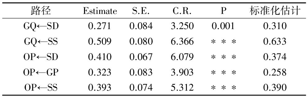 路径EstimateS.E.C.R.P标准化估计GQ←SD0.2710.0843.2500.0010.310GQ←SS0.5090.0806.366∗∗∗0.633OP←SD0.4100.0676.079∗∗∗0.374OP←GP0.3230.0833.903∗∗∗0.258OP←SS0.3930.0745.312∗∗∗0.390