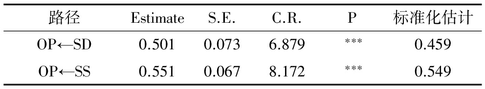 路径EstimateS.E.C.R.P标准化估计OP←SD0.5010.0736.879∗∗∗0.459OP←SS0.5510.0678.172∗∗∗0.549