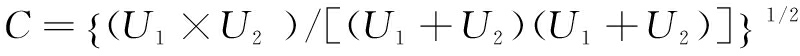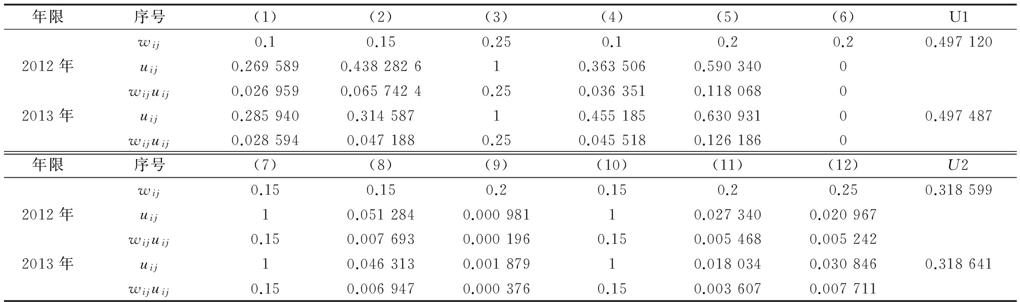 年限序号(1)(2)(3)(4)(5)(6)U1wij0.10.150.250.10.20.20.4971202012年uij0.2695890.438282610.3635060.5903400wijuij0.0269590.06574240.250.0363510.11806802013年uij0.2859400.31458710.4551850.63093100.497487wijuij0.0285940.0471880.250.0455180.1261860年限序号(7)(8)(9)(10)(11)(12)U2wij0.150.150.20.150.20.250.3185992012年uij10.0512840.00098110.0273400.020967wijuij0.150.0076930.0001960.150.0054680.0052422013年uij10.0463130.00187910.0180340.0308460.318641wijuij0.150.0069470.0003760.150.0036070.007711