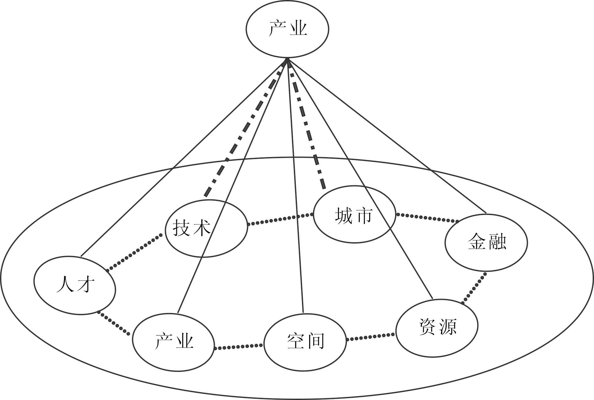 (2)产业与城市及空间耦合。产业与城市耦合主要是战略性新兴产业同城市规划、建设、管理、发展理念、战略的耦合,其有助于实现产城互促、产城互动、产城互融,推动产城交相辉映,如人文历史悠久、自然生态秀美的城市同文化创意产业之间的耦合相适宜,东部沿海城市与海洋产业集群集聚耦合发展相适宜。当前,在中国创新型国家建设进程中,很多城市正在开展创新型城市建设,这为战略性新兴产业发展带来了千载难逢的战略机遇,二者也因此形成了产城之间的互动耦合。产业与空间耦合主要是指产业与空间的优化配置,应遵循产业与人口、生态及环境承载力相结合的主体功能区分类发展原则,其耦合形态通常表现为点、线、轴、带、区等分布状态。这种配置包括:一是产业与区域资源系统相耦合。它是指产业对区域资源的依赖性或区域资源对产业发展的支撑性,这种依赖性或支撑性与区域开放度、企业开放度密切相关;二是产业与区域经济发展相耦合。一个市场经济活跃、经济相对发达、开放度较高的经济体更容易实现战略性新兴产业发展;三是产业与区域创新体系相耦合。构建区域高质量的知识创新体系是促进战略性新兴产业与区域耦合发展的关键因素之一,如北京和上海是中国研究型大学和科研机构等智力资本最为密集的区域。因此,其战略性新兴产业与区域耦合也最为紧密;四是区域网络体系,如交通网络体系、创新网络体系、人才网络体系等,这些都是促进区域产业与空间加快耦合的重要因素。本文所指的耦合特别涉及产业区位选择问题,通常在智力资本密集、交通便捷、资源要素丰富区域等进行战略性新兴产业布局(见图2)。