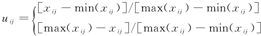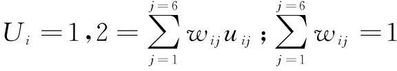 式(1)中,上式uij为正向指标,数值越大越好;下式uij为负向指标,数值越小越好。其中,uij为第i个系统的第j个指标,其反映了xij对uij贡献的大小,数值范围为0≤uij≤1;i取值为1和2;j取值为1~6;max(xij)、min(xij)分别为指标xij的最大值和最小值。由于创新型城市系统与战略性新兴产业系统是两个不同且相互影响的子系统,各指标对总系统的贡献程度可通过集成方法来实现,如采用线性加权法。具体公式如下: