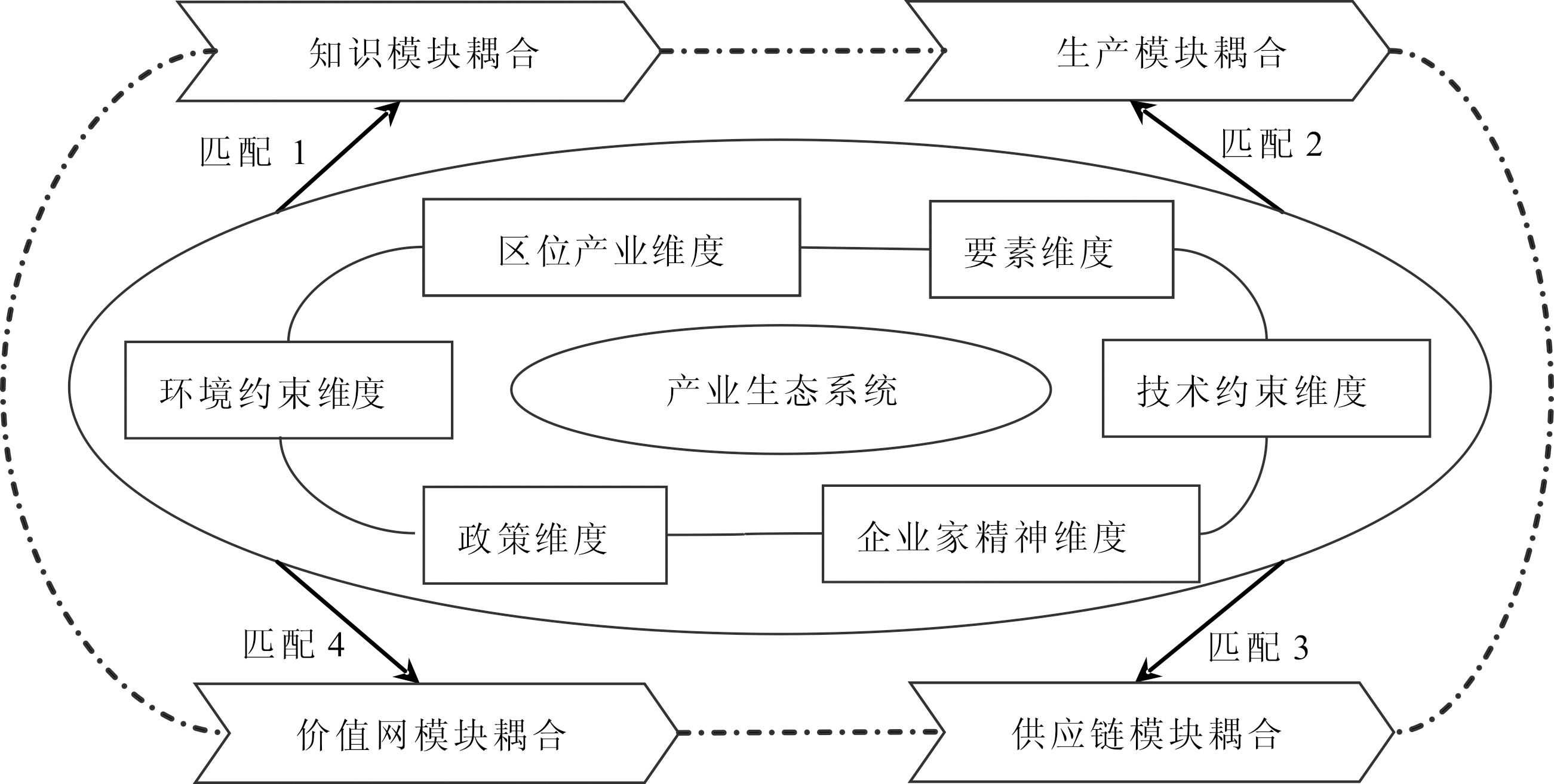 总体来看,战略性新兴产业生态耦合模式是基于城市及空间生态和产业生态与价值链条相耦合的一种生态适应性、匹配性模式,也是一种基于特定区位产业维度、政策维度、要素资源维度(包括人力资源维度)、技术约束维度、环境约束维度、企业家精神维度等资源整合与战略性新兴产业发展之间有效匹配的共生耦合模式,是众多基于价值链环节分化而成的多模块耦合集合体(见图6)。