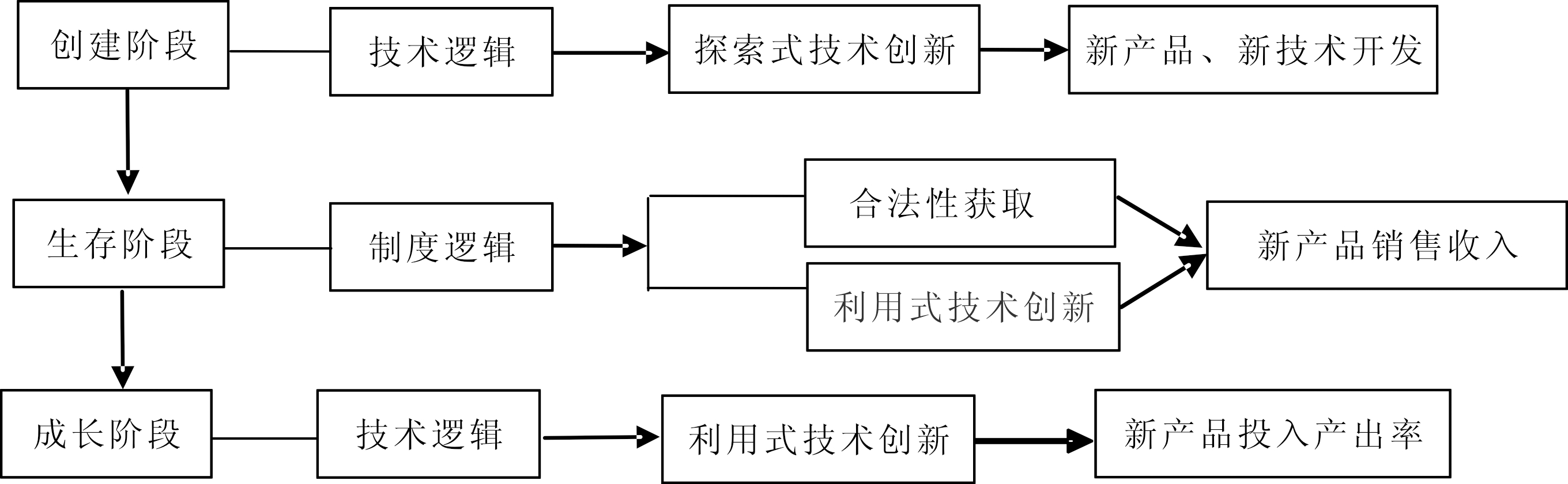 关于制度逻辑、技术逻辑对企业创新绩效的影响,已经有大量理论和实证研究,但是研究结论并不一致。技术逻辑强调技术研发的意愿和能力,Robbins[2]指出重视技术创新的探索者会不断开发新产品。技术先进性会使新创企业获得竞争优势,赢得市场。Gatignon和Xuereb[1]假定顾客偏好高技术产品,研发新产品更有利于获得销售收入,并提高创新绩效。然而也有学者认为只有技术创新有效地生成产品,并得到消费者的认可,获得好的绩效,技术对企业来说才是有意义的[2]。新技术不一定获得认可,因为顾客对新产品不了解,出于降低风险的考虑或者情感依赖的原因,他们可能忠于之前的产品。如果一味关注技术,则会陷入“创造力竞争”的怪圈,消耗企业资源,对企业发展产生抑制作用[3]。同样,合法性的获取对企业生存和发展起着重要作用[4,5],对企业创新绩效也有重要促进作用。首先,合法性决定利益相关者对企业创新活动的认可度,有助于从利益相关者那里获得关键资源[5] ,应用于企业创新。其次,有学者提出通过模仿获得合法性,克服创新者的不确定性[6],将使创新产品更容易进入市场,因为市场新进入者往往面临新产品或服务方面的“新进入缺陷”。但是,合法性强调制度的同构作用,如果仅仅采取依从型战略来获得合法性,盲目地模仿、遵守,将不利于创新。上述结论的不一致很可能因为学者们都是研究企业所处某一阶段采取某种逻辑导向的某种状态,没有从动态变化视角看问题,一旦环境发生改变,影响效果也就随之发生变化。