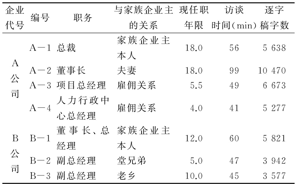 资料收集的主要方式为深度访谈。在数据收集过程中,为了减少误差和研究者的主观影响,采用调查者三角验证,每次访谈均由研究团队共同参与。受访者主要为家族企业主、家族高管和非家族高管,其基本资料如表3所示。另外,资料收集工作还包括以研究者身份参与企业观察,主要涉及现场参观、参加例会等。