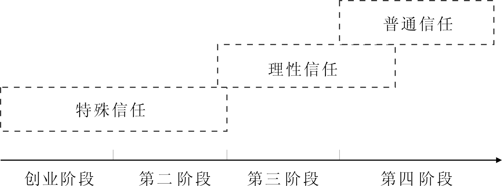家族企业高管团队具体属于哪种信任类型则是由家族企业所处发展阶段决定的。在不同家族企业发展阶段,高管团队的构成存在较大差异,表现出不同的高管团队信任格局。对处于创业阶段、第二阶段的家族企业,高管团队在信任互动过程中会受到个体、团队、组织3个层面的影响,尤其是高管成员之间亲缘关系的影响,最终形成普通信任、理性信任、特殊信任的差序信任格局。而处于第三、第四阶段的家族企业则会加强制度建设以及内控系统管理,逐步实现企业规范化、职业化,使高管团队之间由初期判断到相互了解再到彼此认同,最终形成以制度为主、伦理规则为辅的理性信任模式,如图5所示。