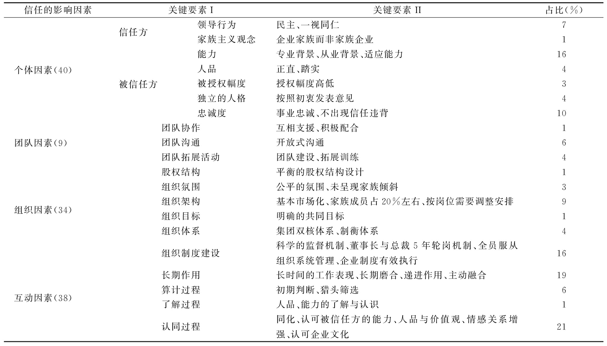 信任的影响因素关键要素I关键要素II占比(%)个体因素(40)信任方领导行为民主、一视同仁7家族主义观念企业家族而非家族企业1被信任方能力专业背景、从业背景、适应能力16人品正直、踏实4被授权幅度授权幅度高低3独立的人格按照初衷发表意见4忠诚度事业忠诚、不出现信任违背10团队因素(9)团队协作互相支援、积极配合1团队沟通开放式沟通6团队拓展活动团队建设、拓展训练4组织因素(34)股权结构平衡的股权结构设计1组织氛围公平的氛围、未呈现家族倾斜3组织架构基本市场化、家族成员占20%左右、按岗位需要调整安排9组织目标明确的共同目标1组织体系集团双核体系、制衡体系4组织制度建设科学的监督机制、董事长与总裁5年轮岗机制、全员服从组织系统管理、企业制度有效执行16互动因素(38)长期作用长时间的工作表现、长期磨合、递进作用、主动融合19算计过程初期判断、猎头筛选6了解过程人品、能力的了解与认识1认同过程同化、认可被信任方的能力、人品与价值观、情感关系增强、认可企业文化21