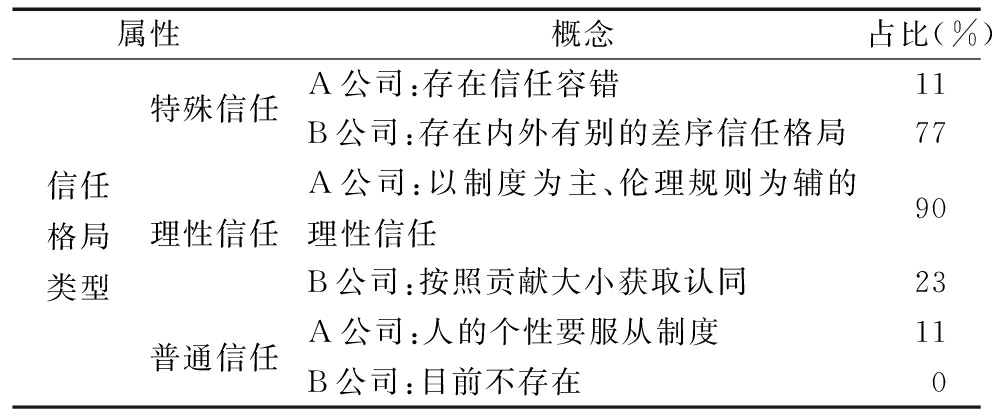 属性概念占比(%)信任格局类型特殊信任A公司:存在信任容错11B公司:存在内外有别的差序信任格局77理性信任A公司:以制度为主、伦理规则为辅的理性信任90B公司:按照贡献大小获取认同23普通信任A公司:人的个性要服从制度11B公司:目前不存在0