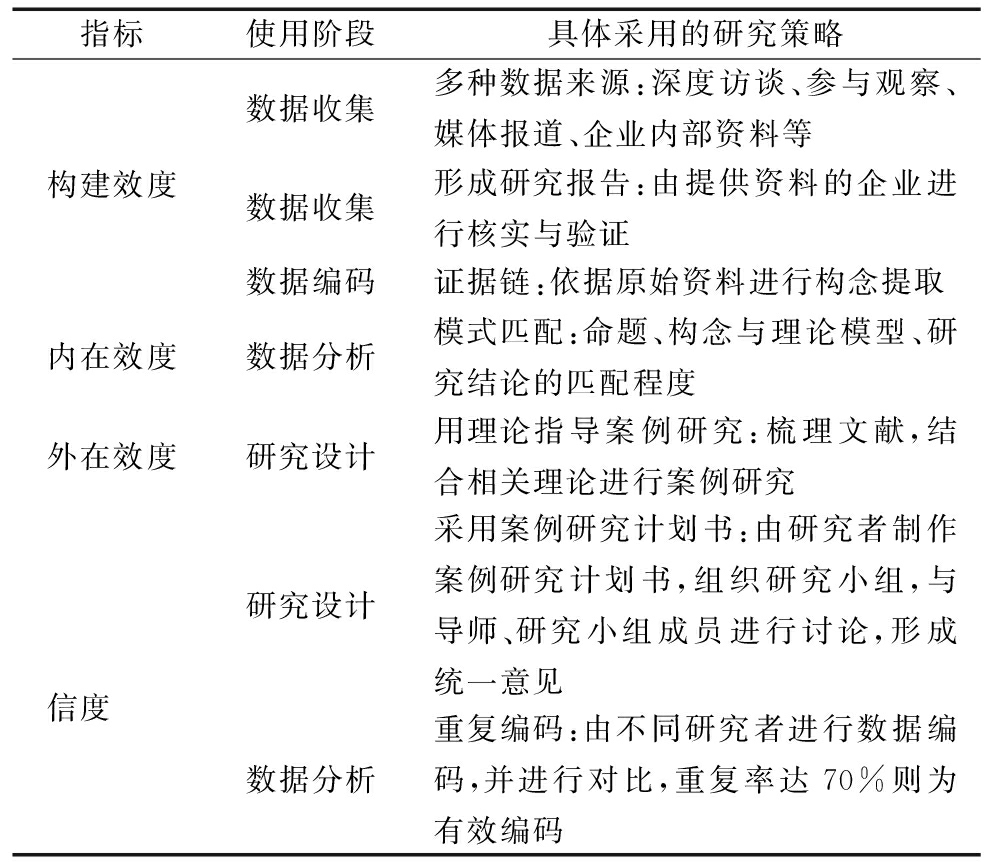 在质性研究中,案例研究方法是一种遵循“理论回顾—案例研究设计—数据搜集—数据分析—案例研究撰写”流程,以质性数据收集和分析为主、以定量数据收集和分析为辅,从而解答建立在具有情境性特征实践基础上的、以理论构建或检验为目的的实证研究方法[13]。本文采用案例研究中的理论构建型案例研究法,综合分析对比个案组成的案例集合,分析其一致性和异质性,不断归纳,提出理论命题。为了保证研究的信度和效度,本文严格依据Yin[14]提出的信度、构建效度、内在效度、外在效度这4个检验指标,对研究案例进行规范。保证研究信度和效度的策略如表1所示。
