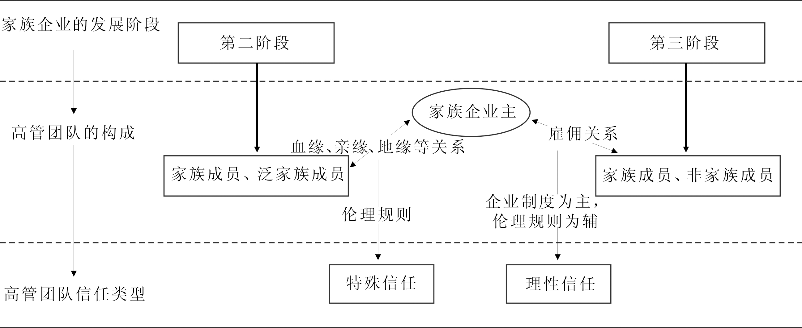 在不同发展阶段,家族企业高管团队信任格局不同,主要表现在企业组织制度建设上。对于发展规模较小的家族企业,其高管团队构成比较单一,信任度较高,战略决策复杂度较低,特殊信任格局能够满足企业战略决策需要。但随着家族企业的发展,高管团队构成逐渐复杂化,家族企业高管团队之间会呈现出差序信任格局。这样的信任格局无法完全发挥职业经理人的作用,企业发展会受到制约。因此,任何阶段的家族企业,都应尽早健全企业制度,使高管团队间形成以遵循企业制度为主、伦理规则为辅的理性信任模式。
