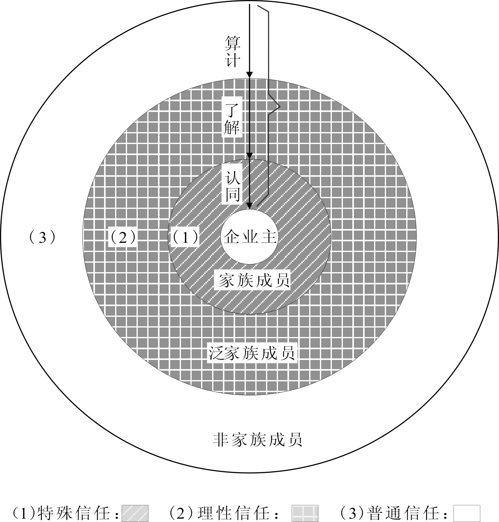 在家族企业中,由于同时存在家族成员、泛家族成员和外聘职业经理人,因而其信任具有独特性。社会心理学家韦伯[1]通过对中国人信任关系进行研究分析,将信任分为普遍信任和特殊信任。对于中国人的信任关系,费孝通提出的差序格局理论最具影响力。他将人际格局比作水面泛开的涟晕,由自己延伸开去,按离与自己距离的长度来划分亲疏[2]。其直接表现形式是以家族企业主为核心,按照血缘、亲缘、地缘对企业成员进行划分,形成“圈内信任”与“圈外信任”的等差信任关系。这种“圈内信任”更类似韦伯提出的特殊信任,而“圈外信任”更多的是基于制度、契约等形成的普遍信任。除此之外,李东[3]从家族理性的角度提出了家族企业的第三类信任关系,即家族理性信任,这种信任关系介于情感信任与制度信任之间,是个人利益与家族利益的均衡,既受到制度的约束,又符合伦理规则的信任机制。Lewicki等[4]按照信任的发展过程,将信任划分为算计型信任、了解型信任、认同型信任。