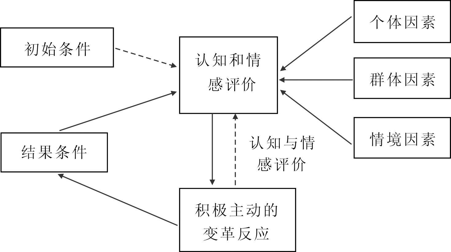 持变革准备过程观的学者认为,概念模糊和不一致的部分原因是,学界在概念化时采取了静态、片段式的状态观,没有将变革准备看作连续过程[9]。变革成功不能仅考量变革的第一阶段(解冻阶段),还要关注变革阶段和再冻结阶段。变革准备过程观采纳变革全过程视角,细化了一般意义上的变革态度,突破了状态观孤立、静态的局限,把变革准备视为持续、递归并贯穿于既定变革实施始终的全过程[1]。Walinga[17]认为,变革准备是组织成员变革决心与意愿的体现,通过案例分析发现变革准备源于对缺乏支配感(失去对现有资源的控制)的容忍,并且在认知评价、注意聚焦和感知控制等的序贯作用下形成、强化。Stevens[9]指出,变革准备概念化不应仅局限于区分变革态度、意图或行为,还需要关注更为一般意义上的反应与过程。在他提出的基于过程的变革准备概念化模型中,变革准备被解释为组织成员对变革条件的认知和情感评价,评价与变革反应相联系,并形成连续的迭代过程,该反应过程的起点是初始条件及其它情境因素(个体、群体与环境),通过结果条件反馈机制,作用于再评价和反应(见图1)。因此,经过不断评价与再评价过程,变革准备可能被强化,也可能被削弱。
