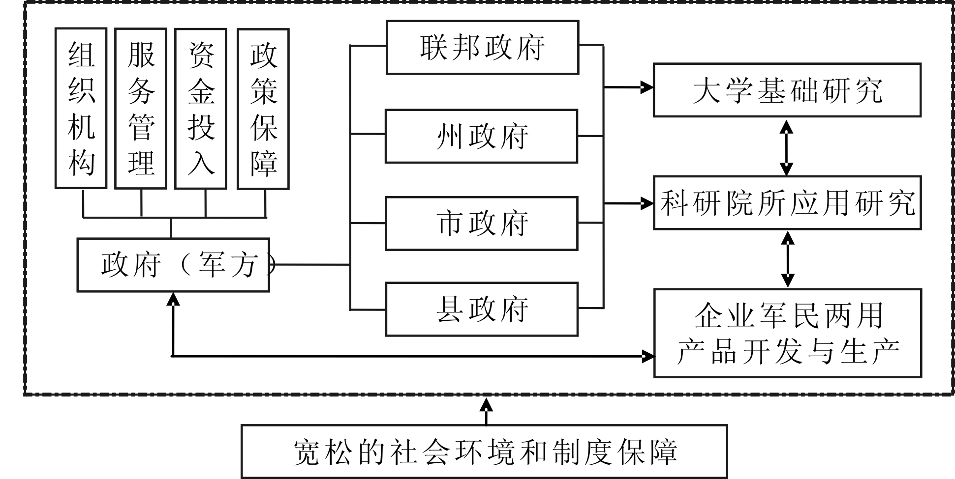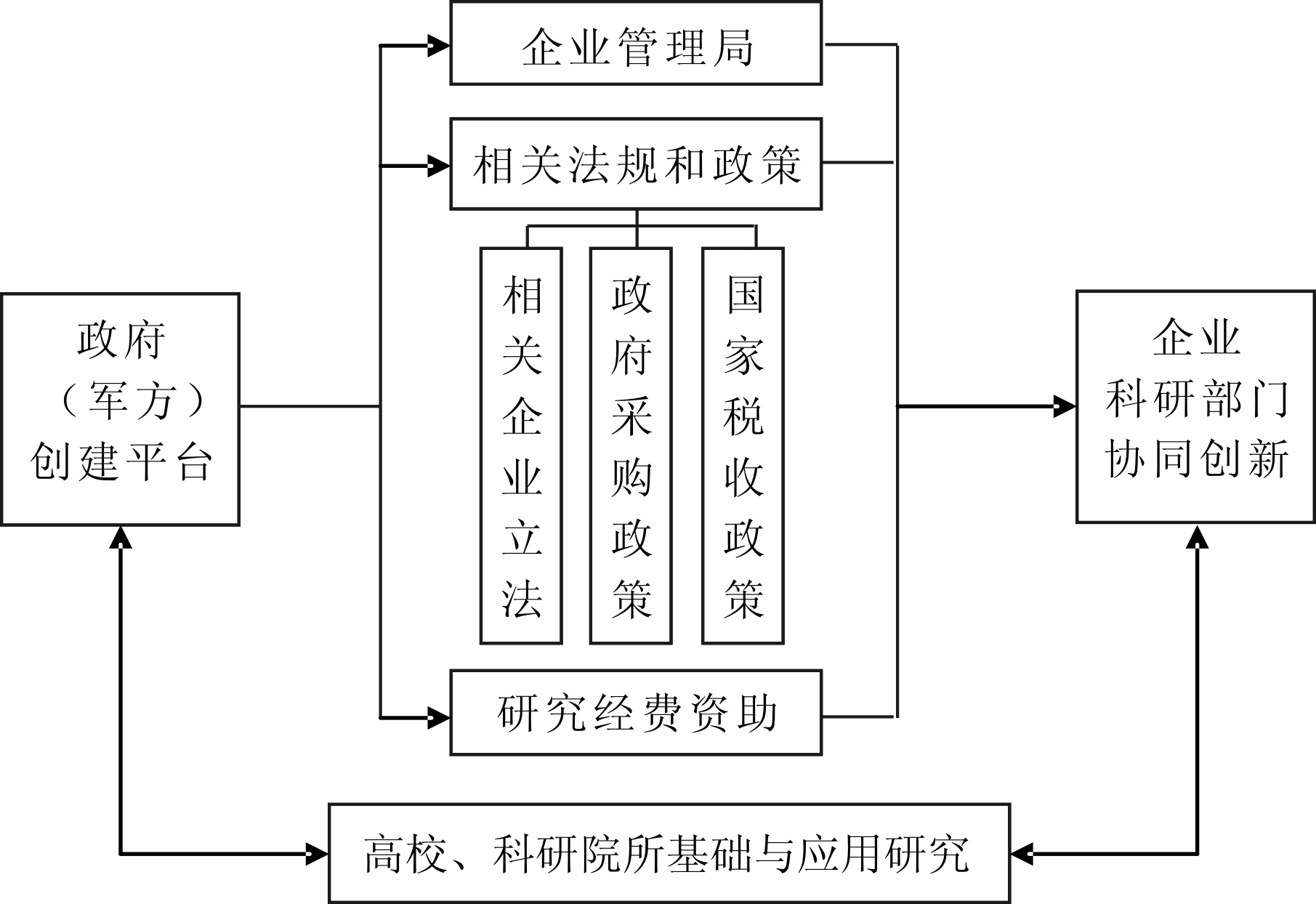 (4)加强政策法规建设,提供法律制度保障。根据国家立法和军委出台的相关条例,构建有利于军民融合型协同创新发展的制度体系。对军方、企业和科研院所在协同创新发展中的具体职能、相关责任、义务等问题作出明确规定,为军民融合型科技工业协同创新体系的有效运行提供宽松的制度环境和法律保障。