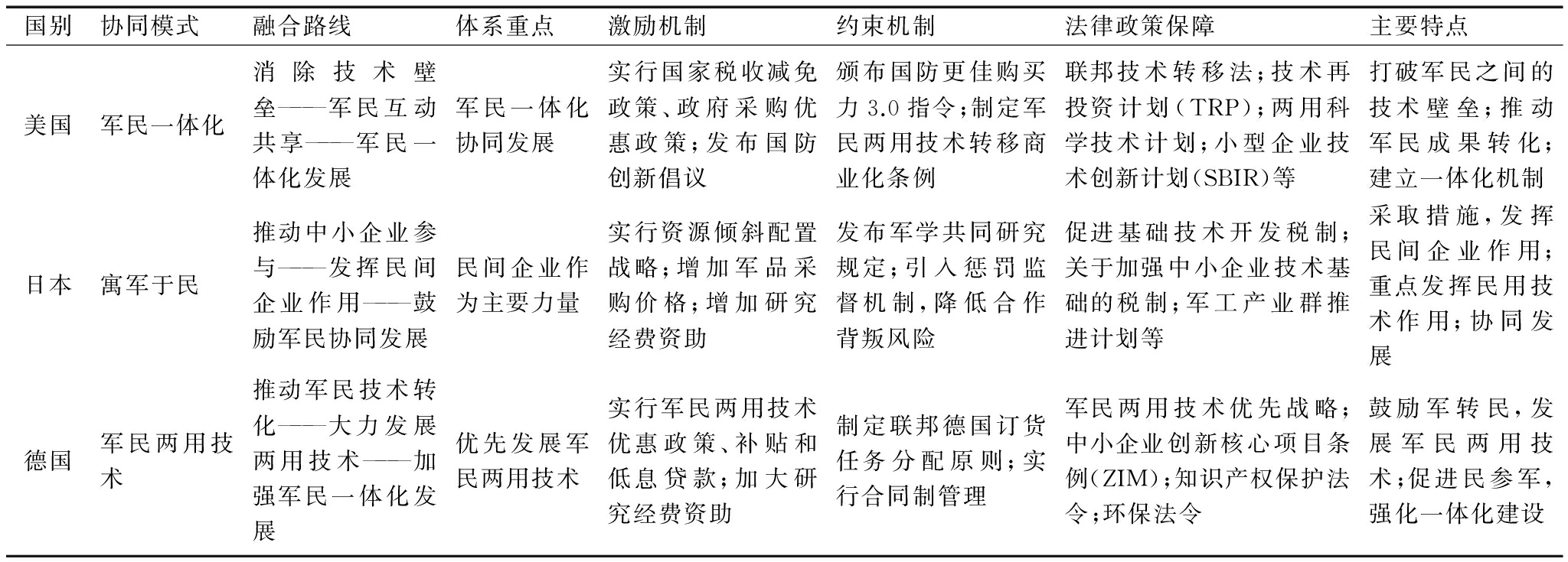国别协同模式融合路线体系重点激励机制约束机制法律政策保障主要特点美国军民一体化消除技术壁垒———军民互动共享———军民一体化发展军民一体化协同发展实行国家税收减免政策、政府采购优惠政策;发布国防创新倡议颁布国防更佳购买力3.0指令;制定军民两用技术转移商业化条例联邦技术转移法;技术再投资计划(TRP);两用科学技术计划;小型企业技术创新计划(SBIR)等打破军民之间的技术壁垒;推动军民成果转化;建立一体化机制日本寓军于民推动中小企业参与———发挥民间企业作用———鼓励军民协同发展民间企业作为主要力量实行资源倾斜配置战略;增加军品采购价格;增加研究经费资助发布军学共同研究规定;引入惩罚监督机制,降低合作背叛风险促进基础技术开发税制;关于加强中小企业技术基础的税制;军工产业群推进计划等采取措施,发挥民间企业作用;重点发挥民用技术作用;协同发展德国军民两用技术推动军民技术转化———大力发展两用技术———加强军民一体化发展优先发展军民两用技术实行军民两用技术优惠政策、补贴和低息贷款;加大研究经费资助制定联邦德国订货任务分配原则;实行合同制管理军民两用技术优先战略;中小企业创新核心项目条例(ZIM);知识产权保护法令;环保法令鼓励军转民,发展军民两用技术;促进民参军,强化一体化建设