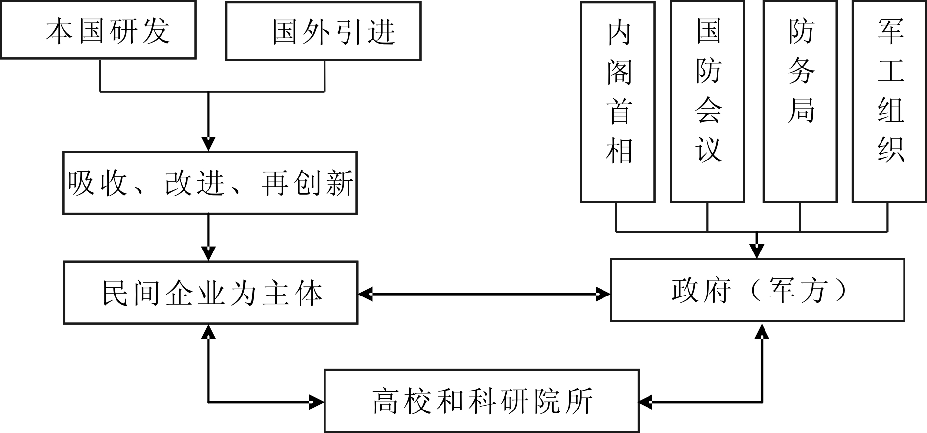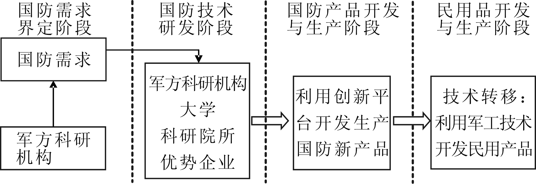 此类运行模式大致分为4个阶段:①国防需求界定。随着国际竞争的不断加剧,国家间的军事技术较量也日益突出。为了维护国家安全,军方会根据国家国防需要进行国防产品开发。为了保证需求界定的有效实现,军方(政府)应适当扩大国防科技需求信息发布范围,建立科技需求信息等级制度;②国防技术研发。国防技术研发难度较大,仅仅依靠军工企业的努力很难达成,需要联合优势企业、高校、科研院所的力量共同完成。优势企业可为军方提供技术支持,高校、科研院所拥有专业技术人才,可为其提供智力援助。在此阶段,军方(政府)应积极吸纳优势企业、大学、科研院所通过公平竞争方式,联合研发或并行研发,以鼓励研发竞争,推进国防技术研发进程;③国防产品开发与生产阶段。通过军方、民用企业、高校及科研院所共同搭建创新平台,最终生产出满足国防需要的国防技术或国防产品;④民用品开发与生产阶段。当国防技术发展成熟后,民用企业可引进国家许可技术进行民品开发,从而实现国防技术向民品转换。同时,军工企业也可以凭借核心技术投身民用市场领域。在此过程中,国家应在符合保密要求的前提下,积极探索建立知识产权转移制度,促进军用技术向民用部门扩散和应用。