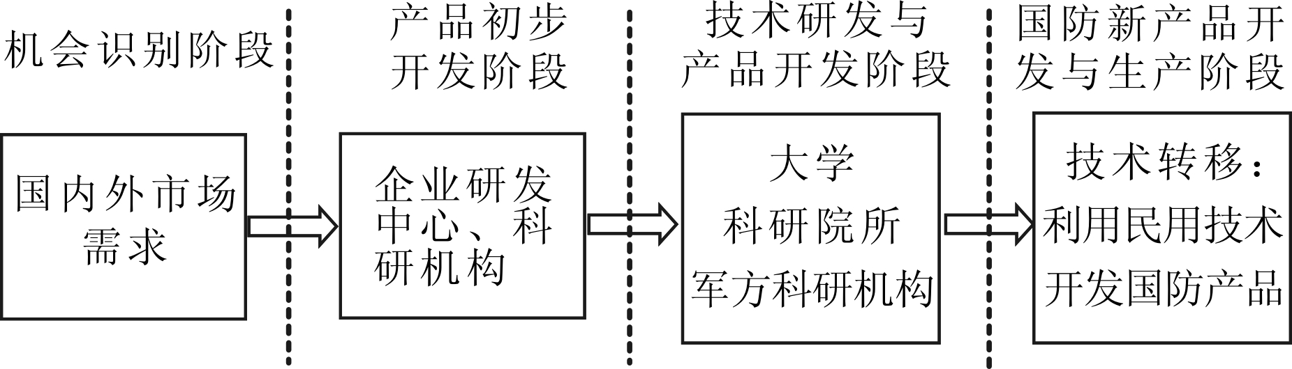 民用需求拉动型协同创新体系“民参军”模式大致分为4个阶段:①机会识别。民用企业作为市场经济的主体,在民用技术开发和生产过程中扮演着十分重要的角色。当国内外市场上开始出现某种需求或者管理者以敏锐的嗅觉感受到市场需求时,民用企业会立刻抓住这一难得的市场机会进行产品研发;②产品开发。企业经过机会识别阶段对研发项目论证可行后,由企业研发中心进行技术初步开发;③技术研发与产品开发。经过初步开发的产品技术尚不成熟,此时企业就会联合军方、高校或科研院所共同协作,对技术展开进一步开发。通过多方共同搭建创新平台,最终生产出满足市场需求的民用品。在这一阶段,应加大政策扶持力度,激励军方利用其技术设施和人员参与民用技术开发,在研发要素投入和研发过程两个环节实现军民融合创新;④国防新产品开发。当民用技术发展成熟后,军方可利用民用技术进行国防新产品开发。在此过程中,军方可通过科技信息收集、学术研讨会、民用技术技博览会、供需见面会等形式收集民用科技信息,为军方采用民用技术提供决策信息支撑。同时,实力雄厚的民用企业也可以凭借先进技术进入军工行业,这是实现国防科技“民参军”的重要阶段。