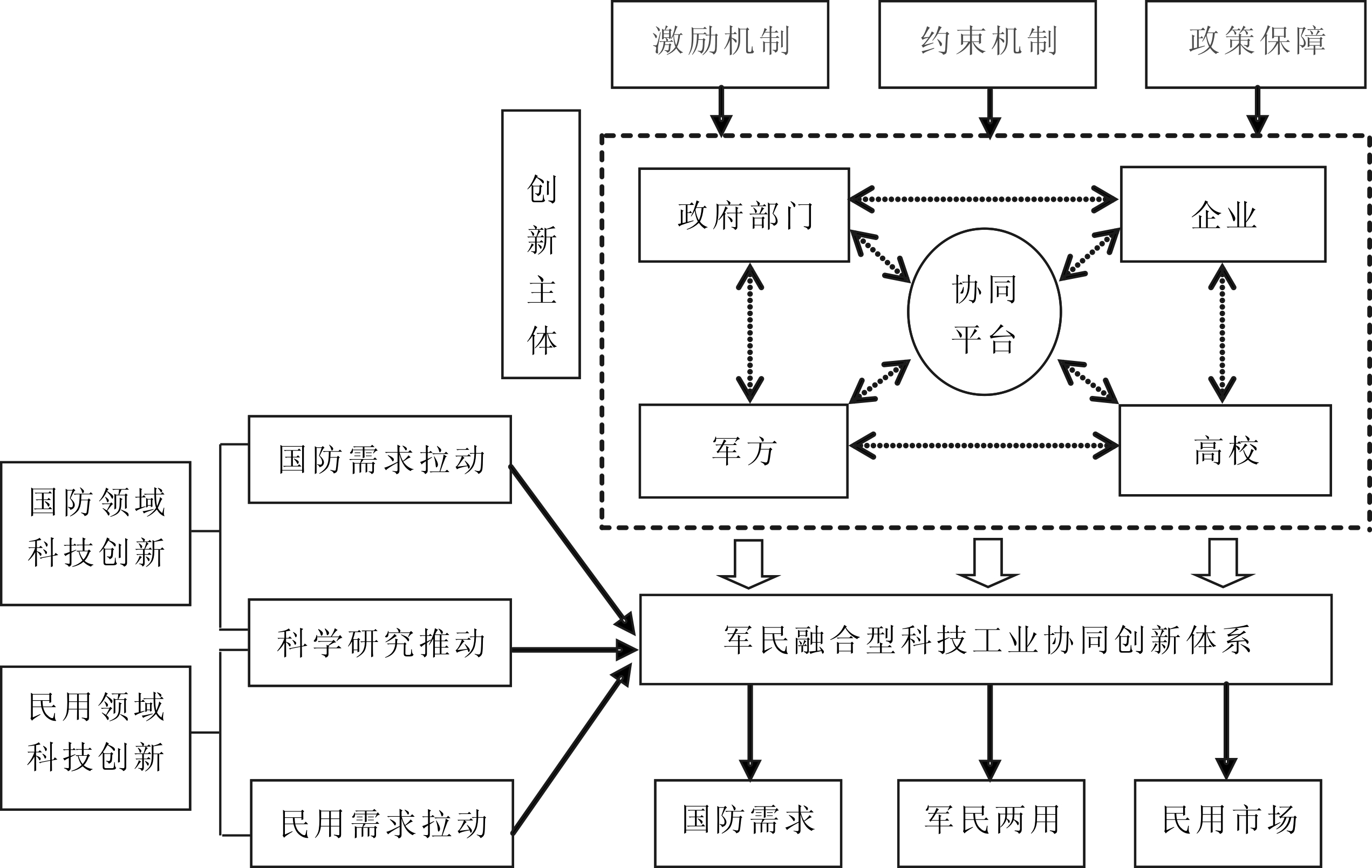 图7 科学研究推动型科技工业协同创新体系“军民一体化”模式