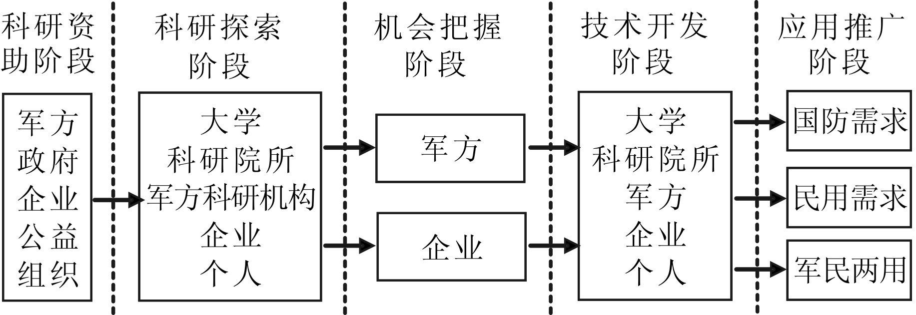 科学研究推动型协同创新体系“军民一体化”模式大致可分为5个阶段:①科研资助。为了保证协同创新体系的有效运行,应建立一个政府资助公共基础科学、先导性技术研究,军方资助国防科技开发,企业资助生产技术及产品开发的科研资助与激励机制。基础科学研究的开展离不开国家(政府)、军方、企业或公益组织的资金支持。其中,最为重要的是政府的各项基金资助、金融倾斜政策及研发投入税收减免制度等;②科研探索阶段。有了资金支持,研究人员才能开展科研探索。除传统科研机构(军方、高校、企业等)外,参与基础科学研究的还应包括企业单位和个人;③机会把握阶段。并不是所有研究成果都具有商业价值或军事价值,只有经过军方和企业识别、论证、选择,才能确定研究成果的应用价值和使用途径,才能对技术展开进一步开发;④技术开发。经过论证、选择后的研究成果一般尚不成熟,军方或民用企业需对技术进行完善。此时,如果技术用于国防领域,则由军方负责开发。如果技术用于商业领域,则由民用企业负责开发。同时,政府通过制定激励性政策,引导军工企业和民用企业向军民融合型两用技术方向发展,从而获取相应的经济利益。例如,制定和完善一系列优惠政策,包括财政补贴、税收减免、投融资政策等;⑤应用推广。经过开发后的技术成果最终将实现产品规模化生产,其具体运行模式见图7。