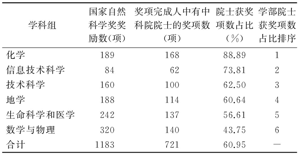 学科组国家自然科学奖奖励数(项)奖项完成人中有中科院院士的奖项数(项)院士获奖项数占比(%)学部院士获奖项数占比排序化学18916888.891信息技术科学846273.812技术科学16010062.503地学18811460.644生命科学和医学24213756.615数学与物理32014043.756合计118372160.95-