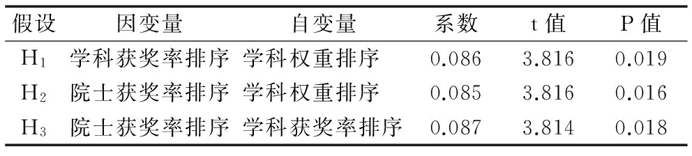 假设因变量自变量系数t值P值H1学科获奖率排序学科权重排序 0.0863.8160.019H2院士获奖率排序学科权重排序 0.0853.8160.016H3院士获奖率排序学科获奖率排序0.0873.8140.018