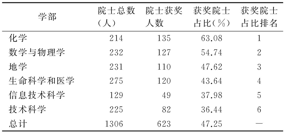 学部院士总数(人) 院士获奖人数 获奖院士占比(%)获奖院士占比排名化学21413563.081数学与物理学23212754.742地学23111047.623生命科学和医学27512043.644信息技术科学1294937.985技术科学2258236.446总计130662347.25-
