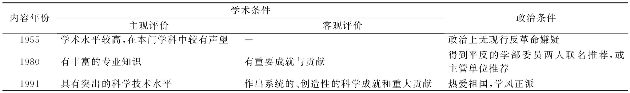 内容年份学术条件主观评价客观评价政治条件1955学术水平较高,在本门学科中较有声望-政治上无现行反革命嫌疑1980有丰富的专业知识有重要成就与贡献得到平反的学部委员两人联名推荐,或主管单位推荐1991具有突出的科学技术水平作出系统的、创造性的科学成就和重大贡献热爱祖国,学风正派