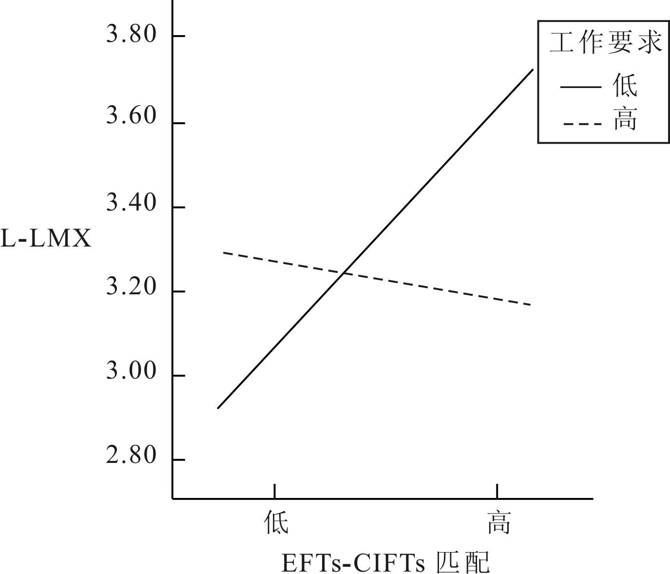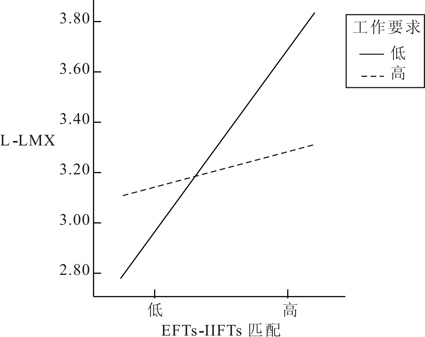 H5:EFTs-IIFTs匹配同L-LMX之间的关系强度随领导者工作要求而变化,当领导者工作要求低时,EFTs-IIFTs匹配同L-LMX之间的关系强度更大。