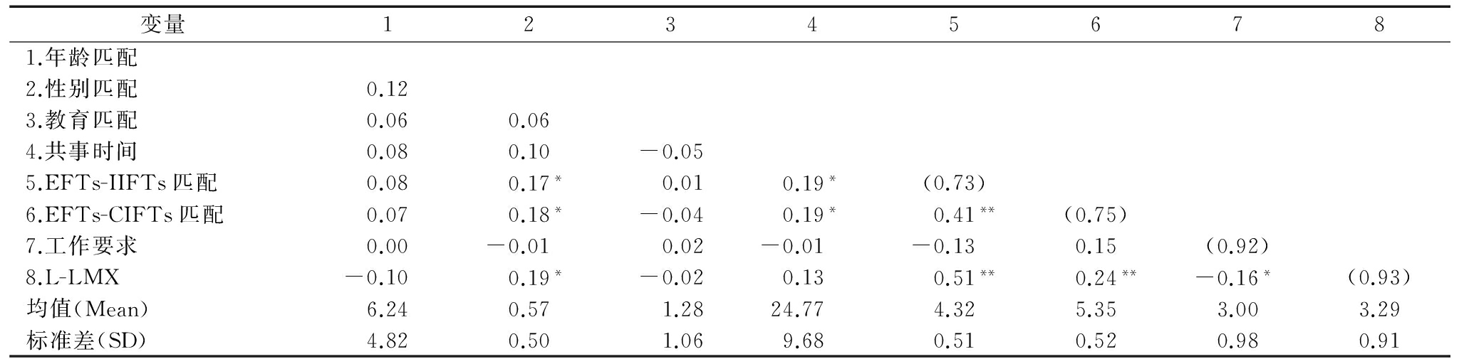 各变量描述性统计及变量间相关系数如表1所示。H3指出,EFTs-IIFTs匹配同EFTs-IIFTs匹配之间存在显著正相关。由表1可见,二者相关系数达到了统计显著水平(r=0.41,p<0.01),H3得到了支持。由表1可见,其它变量之间的相关系数也基本符合本文假设,变量内部一致性信度系数均达到了心理测量学的要求。