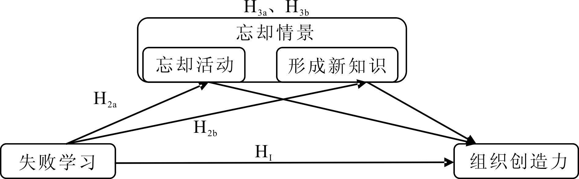 忘却情景能够为失败学习构建一个摒弃、搜寻、吸收、整合知识的平台。失败学习通过忘却活动和形成新知识活动,重新审视组织的文化价值观念、结构制度规范、思维行动模式等,进行扬弃和再学习,有助于企业在创造实践过程中获取更有价值和新奇性的想法并付诸实施,从而提升组织创造力。因此,本文提出以下假设: