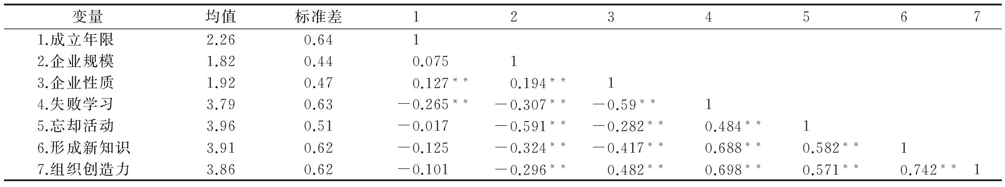变量均值标准差12345671.成立年限2.260.6412.企业规模1.820.440.07513.企业性质1.920.470.127**0.194**14.失败学习3.790.63-0.265**-0.307**-0.59**15.忘却活动3.960.51-0.017-0.591**-0.282**0.484**16.形成新知识3.910.62-0.125-0.324**-0.417**0.688**0.582**17.组织创造力3.860.62-0.101-0.296**0.482**0.698**0.571**0.742**1
