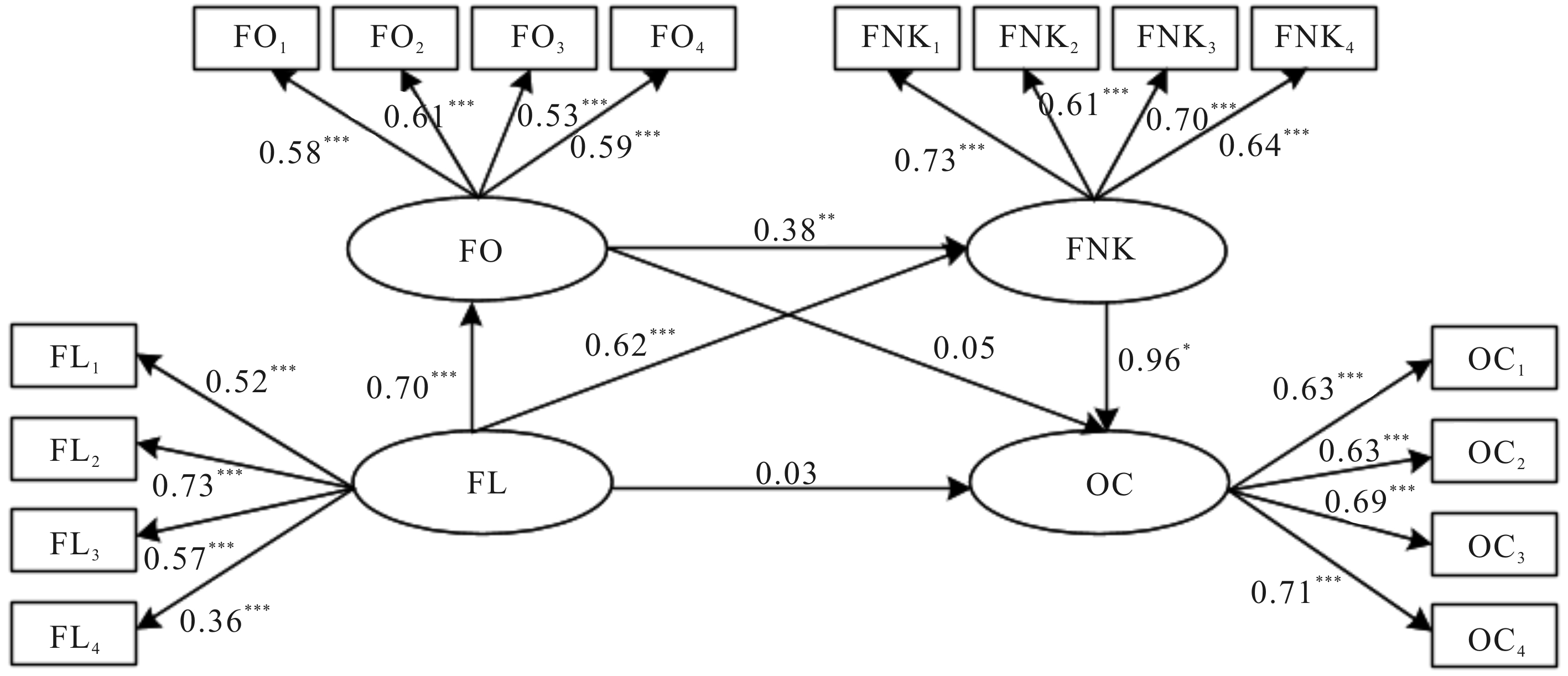 注:FL表示失败学习,FO表示忘却活动,FNK表示形成新知识,OC表示组织创造力;***P<0.001,**P<0.01,*P<0.05