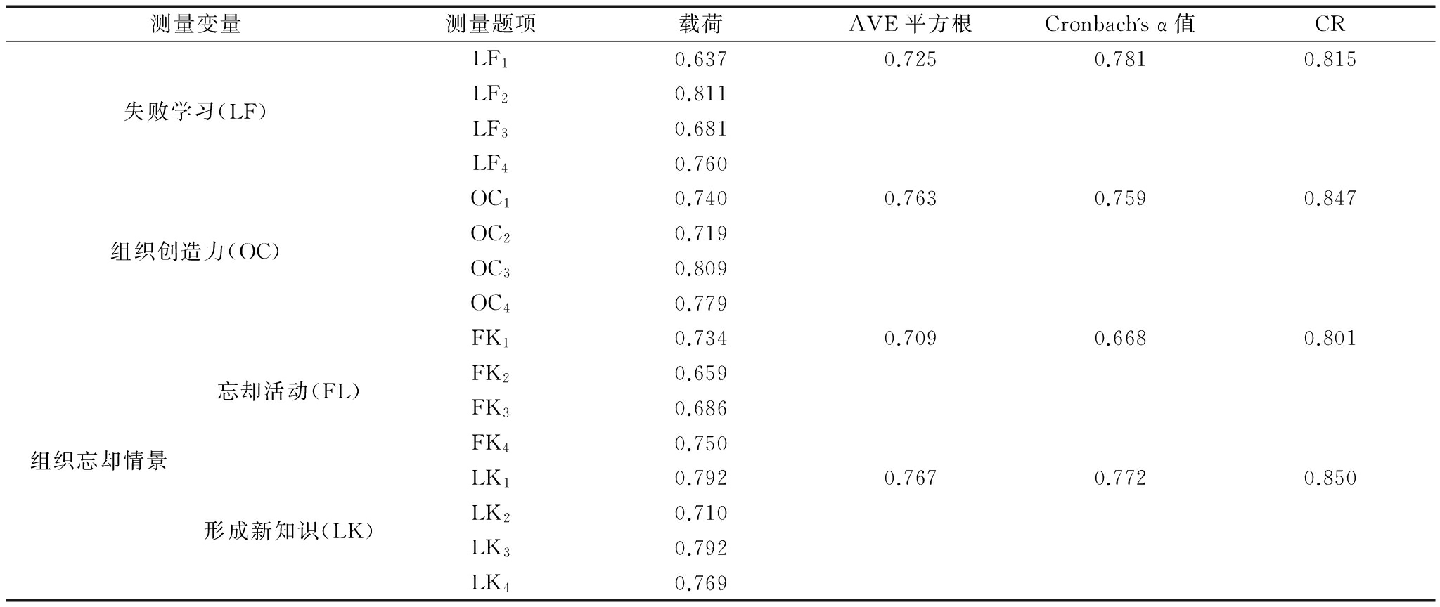 本文使用的量表包括失败学习、忘却情景和组织创造力,变量测量指标均以国内外成熟量表为基础,根据研究目的和具体情景作了适当修改和调整。变量测度采用李克特5级量表,1表示“完全不符合或非常不同意”,5表示“完全符合或非常同意”。