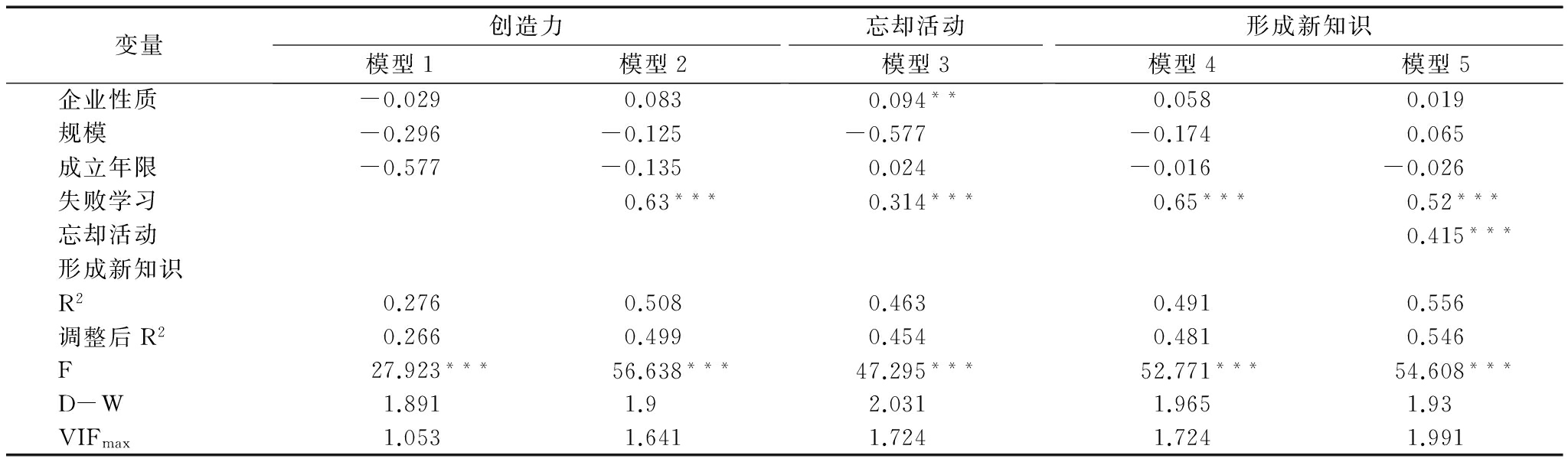 本文使用SPSS19.0对失败学习、组织忘却情景和组织创造力等变量的信度、效度进行检验。如表1所示,失败学习、组织创造力和形成新知识的Cronbach's α均大于0.7,忘却活动略低于0.7,可以满足系数的最小可接受范围。各变量AVE的平方根均大于该变量与其它变量的相关系数,表明各测量指标均具有良好的内部一致性,支持了信度检验。同时,各变量测量的因子载荷均高于0.60,且通过KMO和Bartlett球形检验得到,各变量KMO值均大于0.7,表明各变量能够反映相关构念,收敛效度良好。